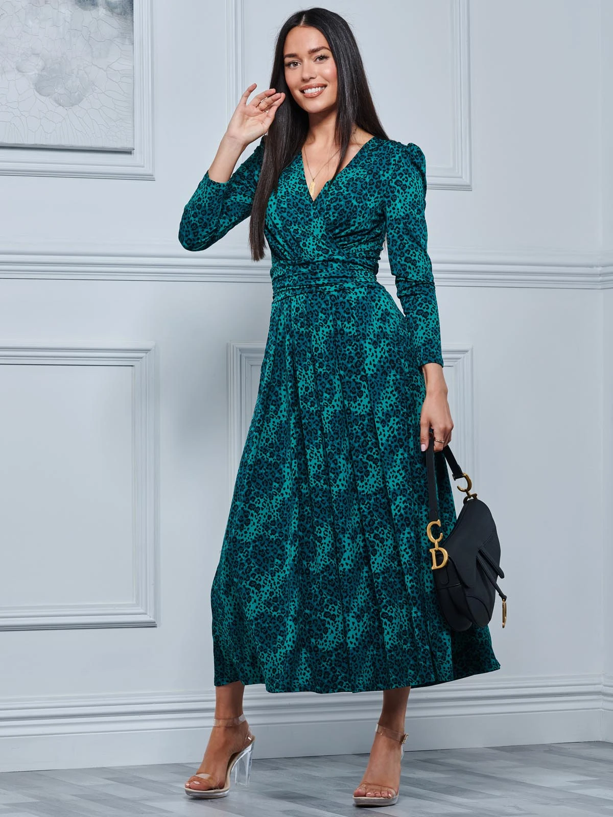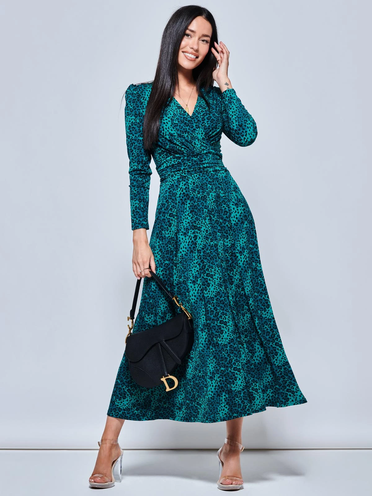 Style colour back into your wardrobe with this striking green animal printed maxi dress. Crafted from our signature non-static and crease-proof jersey material. The dress features a v-neckline with a self-tie ruched waist that gives you a custom fitted silhouette, designed with long sleeves and ideal side pockets.Â
