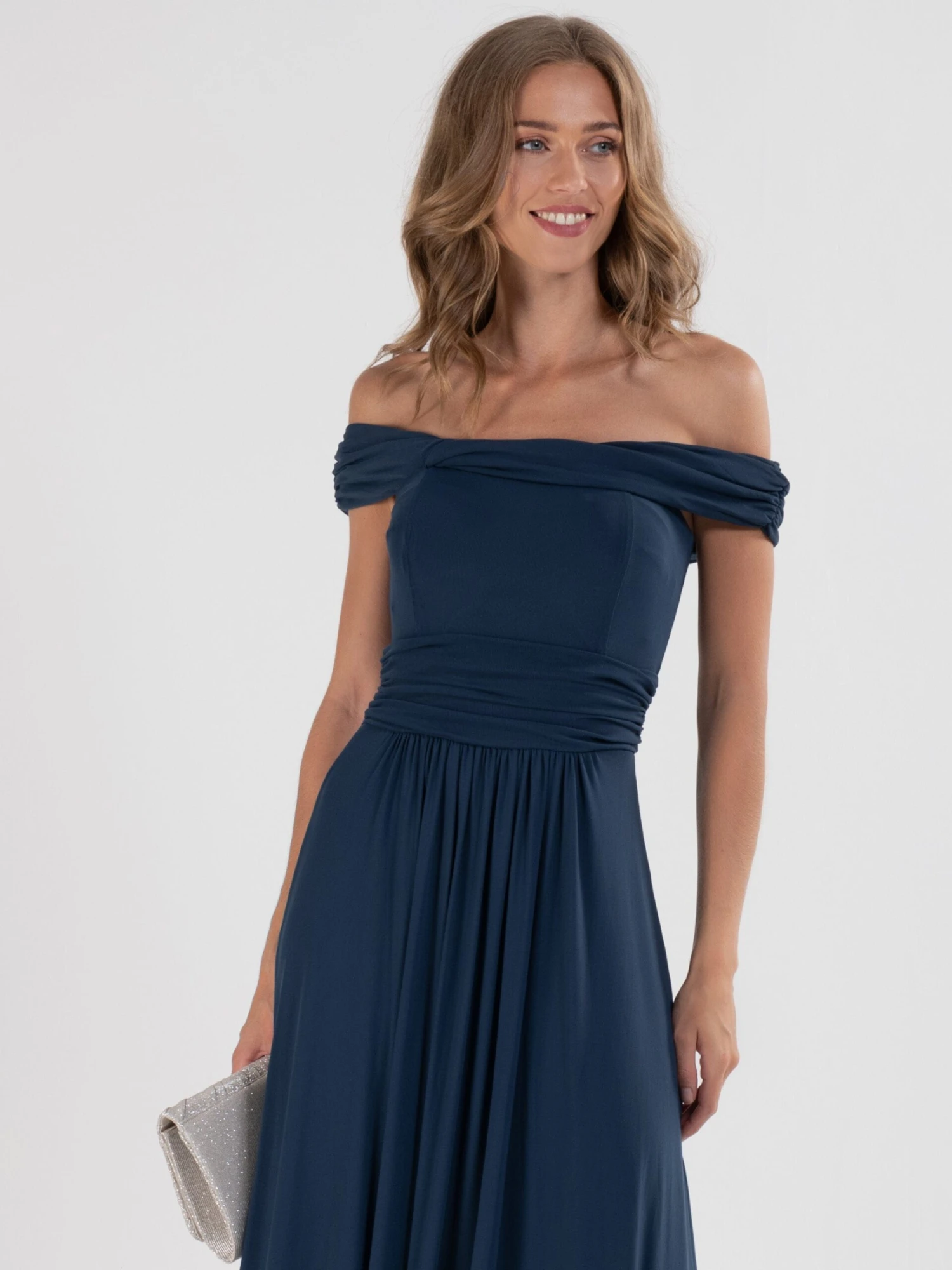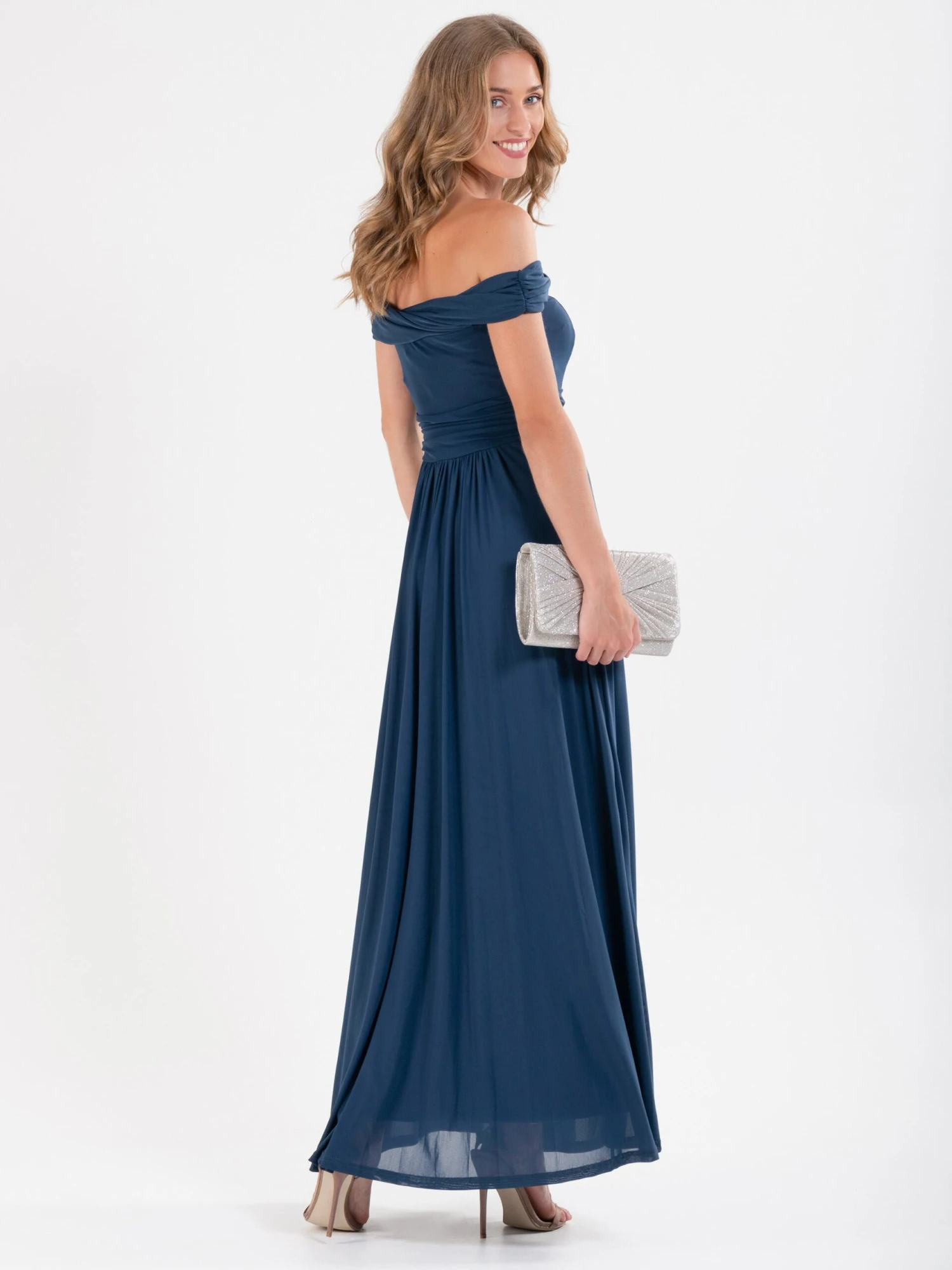 Draped for ultimate sophistication, this maxi dress from Jolie Moi sits off the shoulders with an alluring twist Bardot neckline. It is made from a delicate mesh fabric and nipped-in at the waist before flaring out through the skirt. Fully lined for comfort and finished with a pull on fastening, wear with metallic strappy heels to dazzle at your next occasion invite.