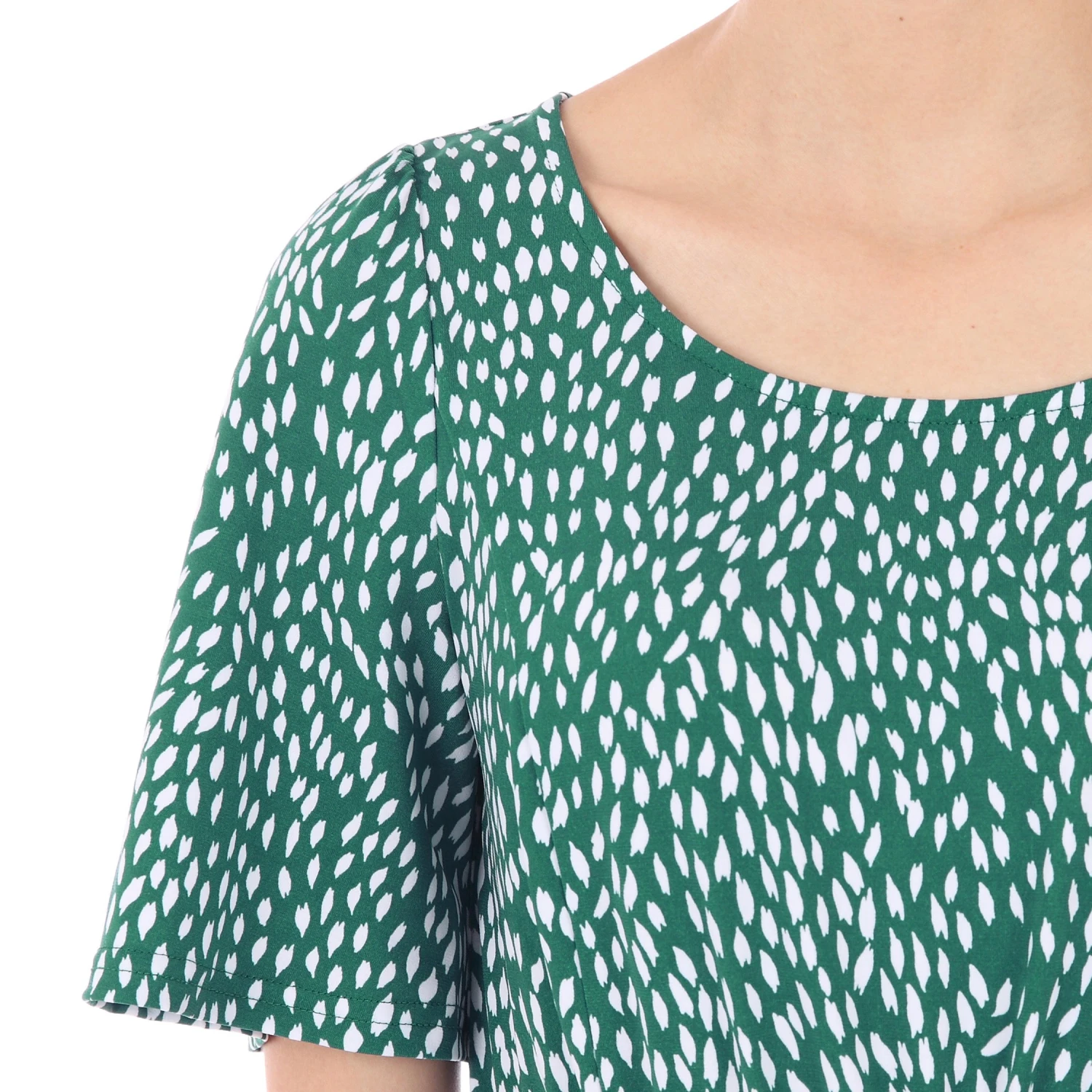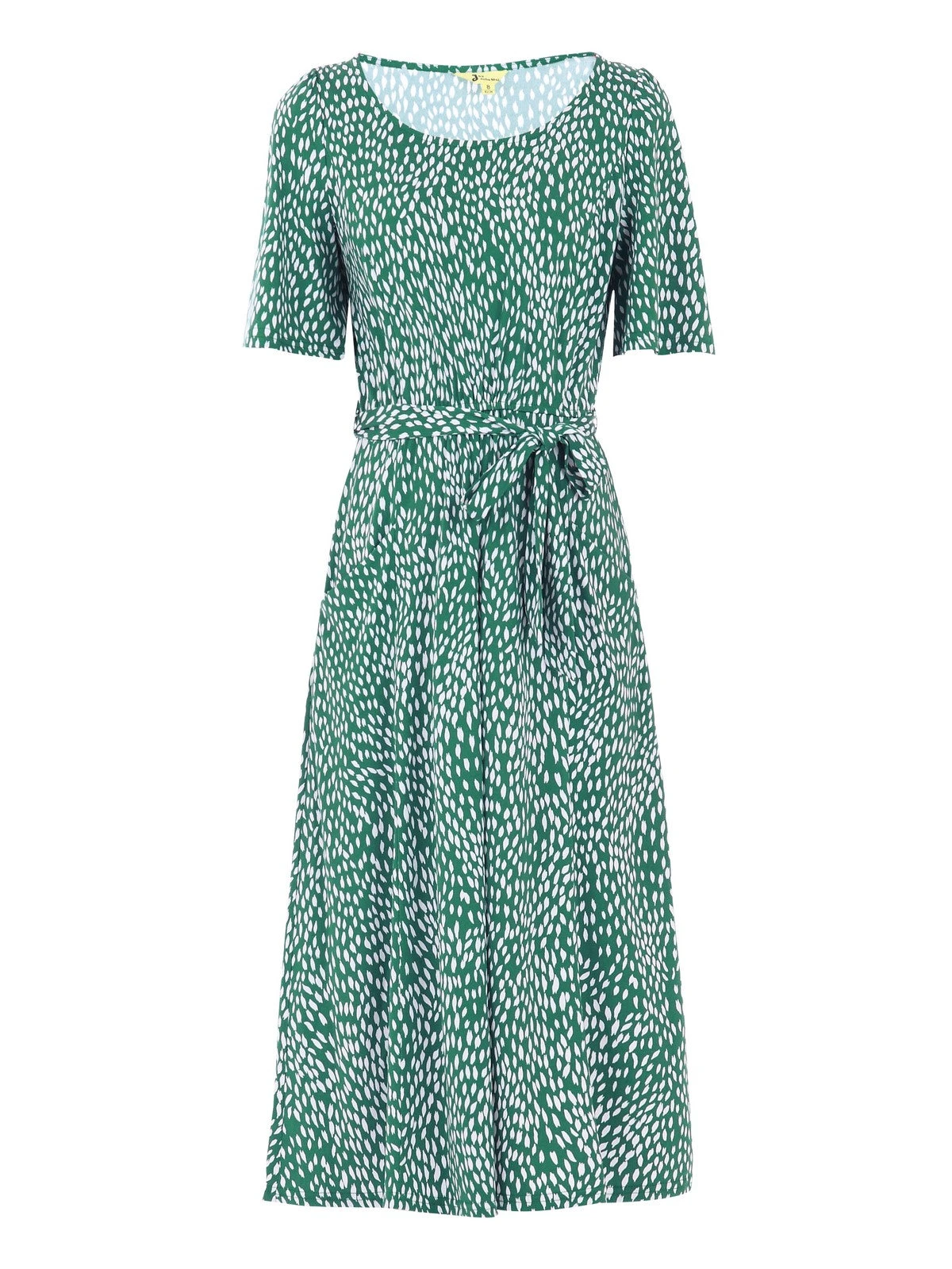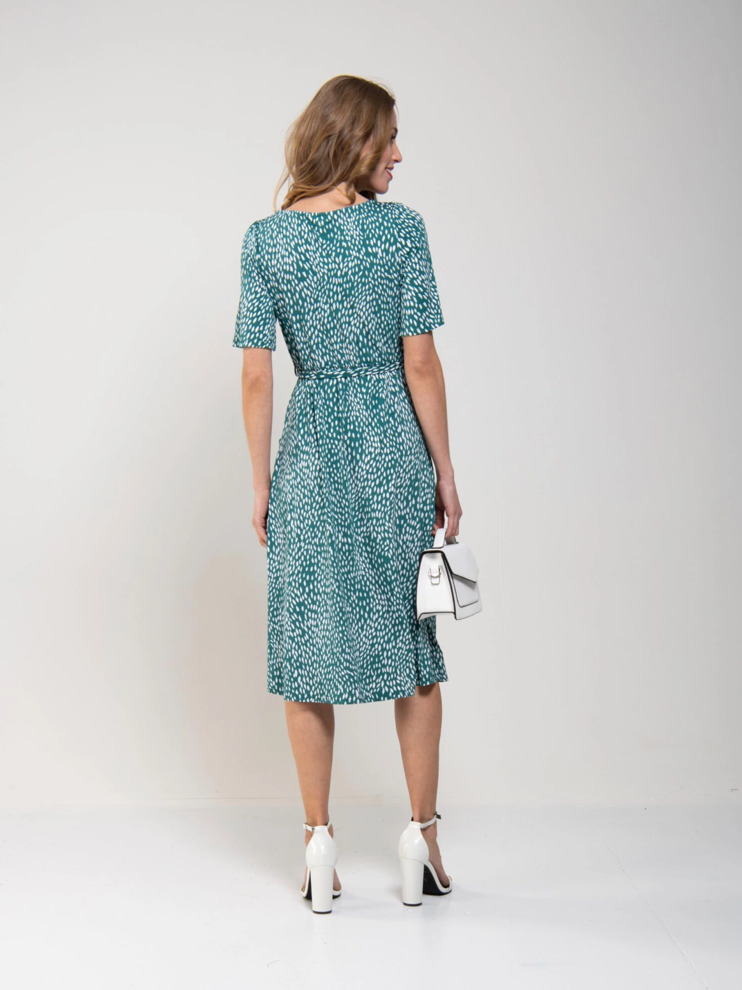 A gorgeous playful day dress to add to your new season wardrobe. this smart midi jersey dress has an on-trend animal print and flared elbow length sleeves. Completed gathered elasticated waist detailing with a detachable belt at the waist. This dress falls to a midi length and can be worn with or without tights with knee high boots or heels.