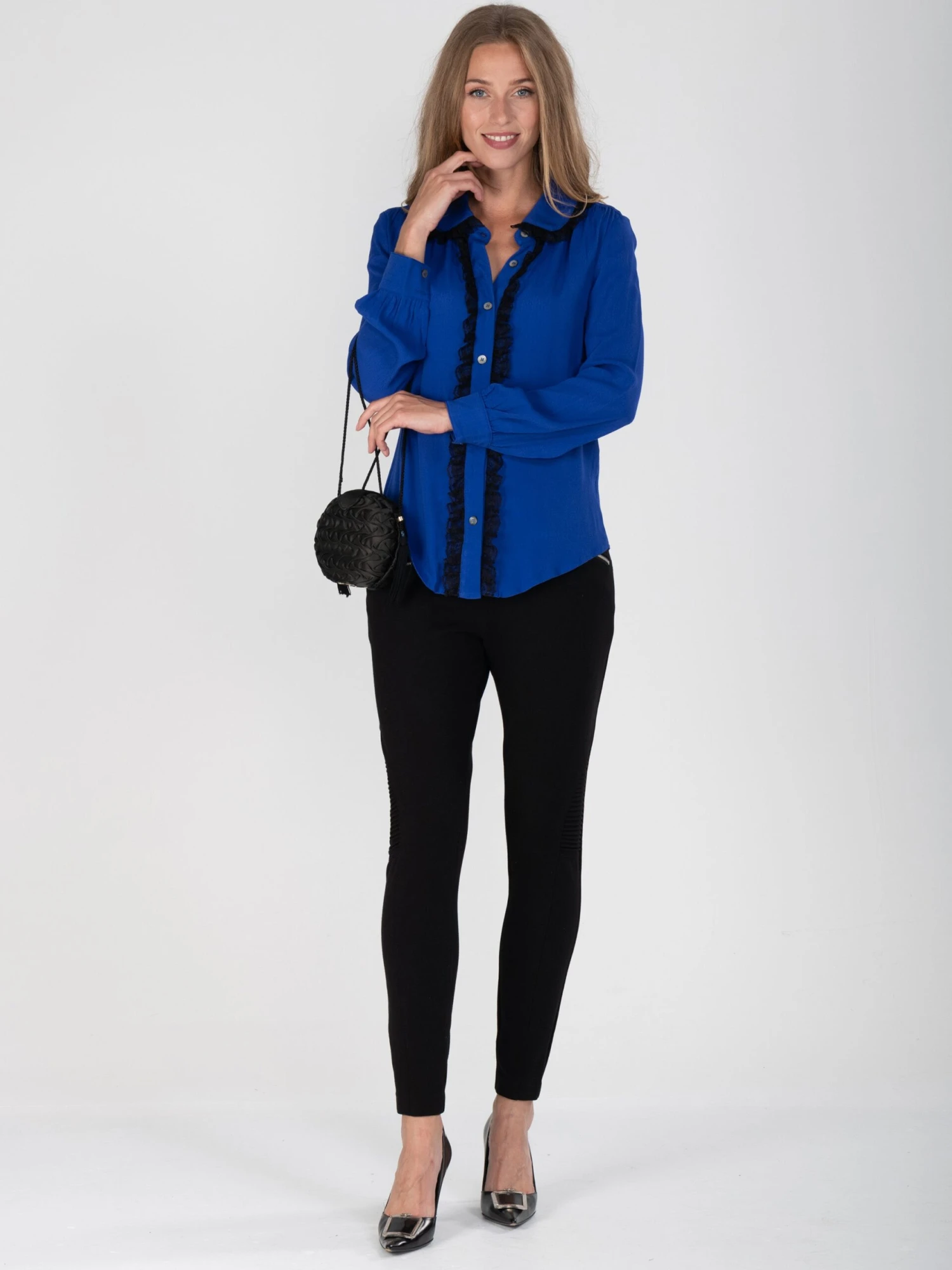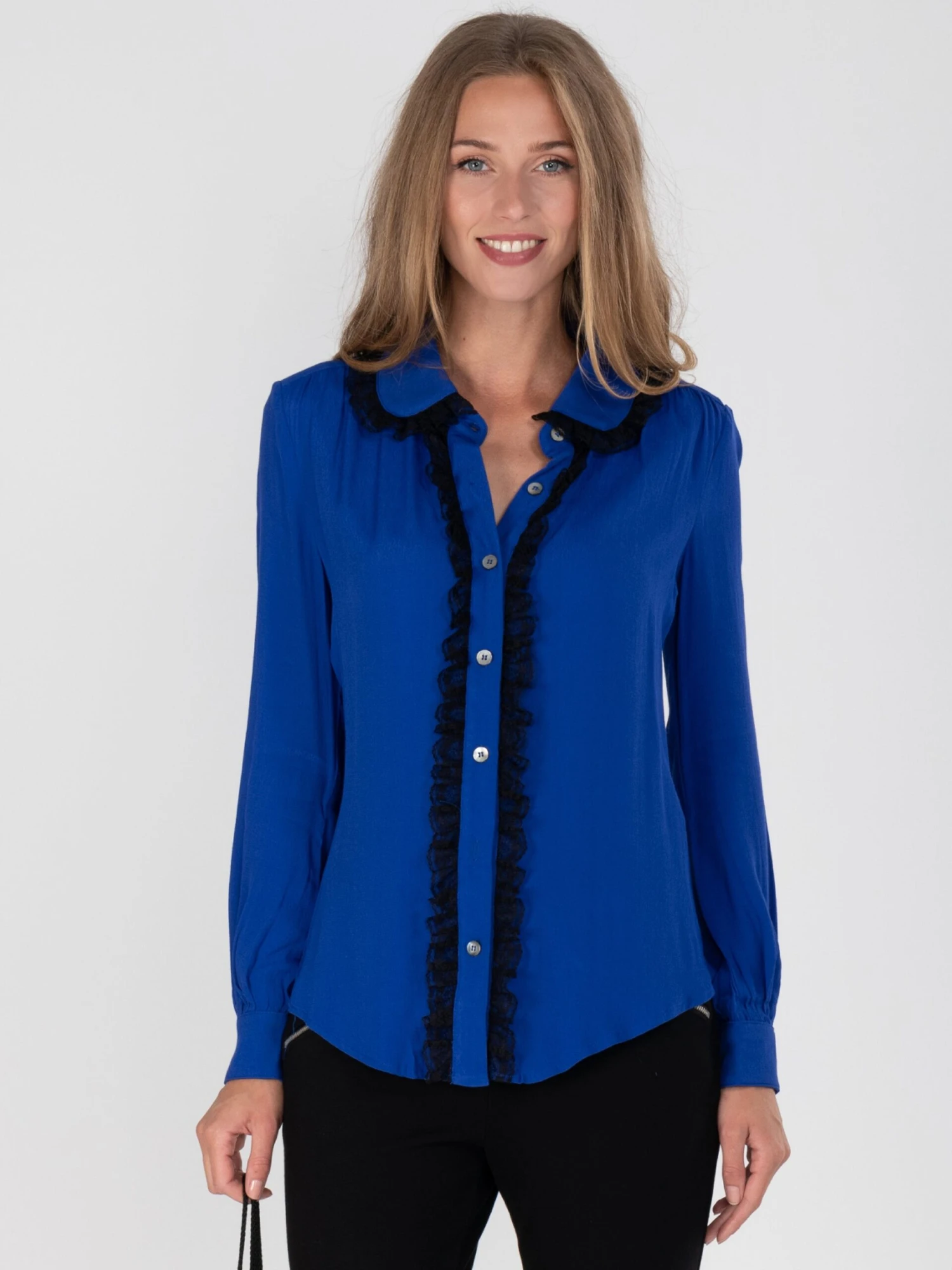 Crafted from a soft jersey material, this piece has a rounded collar and button through front which is finished with beautiful lace detailing.Â
