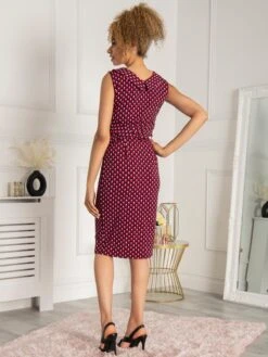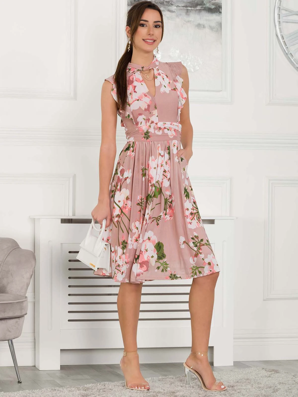 Made from a smooth mesh fabric and cut to a generous skater fit, it is designed with a smart turtleneck with twisted collar and keyhole cut out detailing at the front . Finished with ruffle shoulders and side pockets for easy wear and a nipped-in ruched waistband to create a smooth shape and falls to the knee adding an elegant flow. It would be a beautiful choice for a wedding guest outfit or summer socials. Â