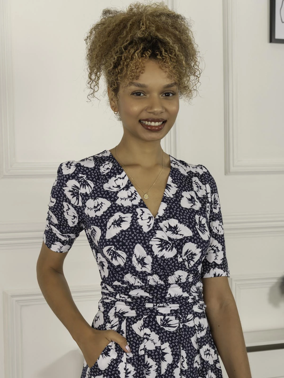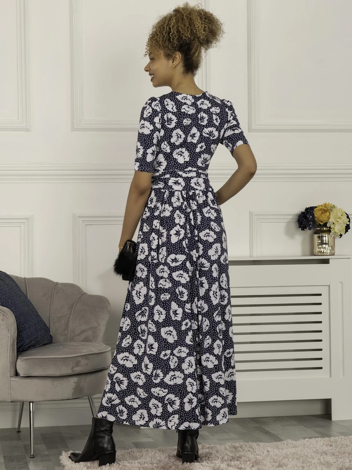Perfect addition to any wardrobe this season. The Evita maxi dress is constructed from our signature non-static and crease proof jersey fabric. Doused with a beautiful abstract floral print. The dress features, short sleeves, a wrapped v-neck line and a ruched elasticated waistband for added comfort. Match with a pair of trainers or sandals for those casual days out.