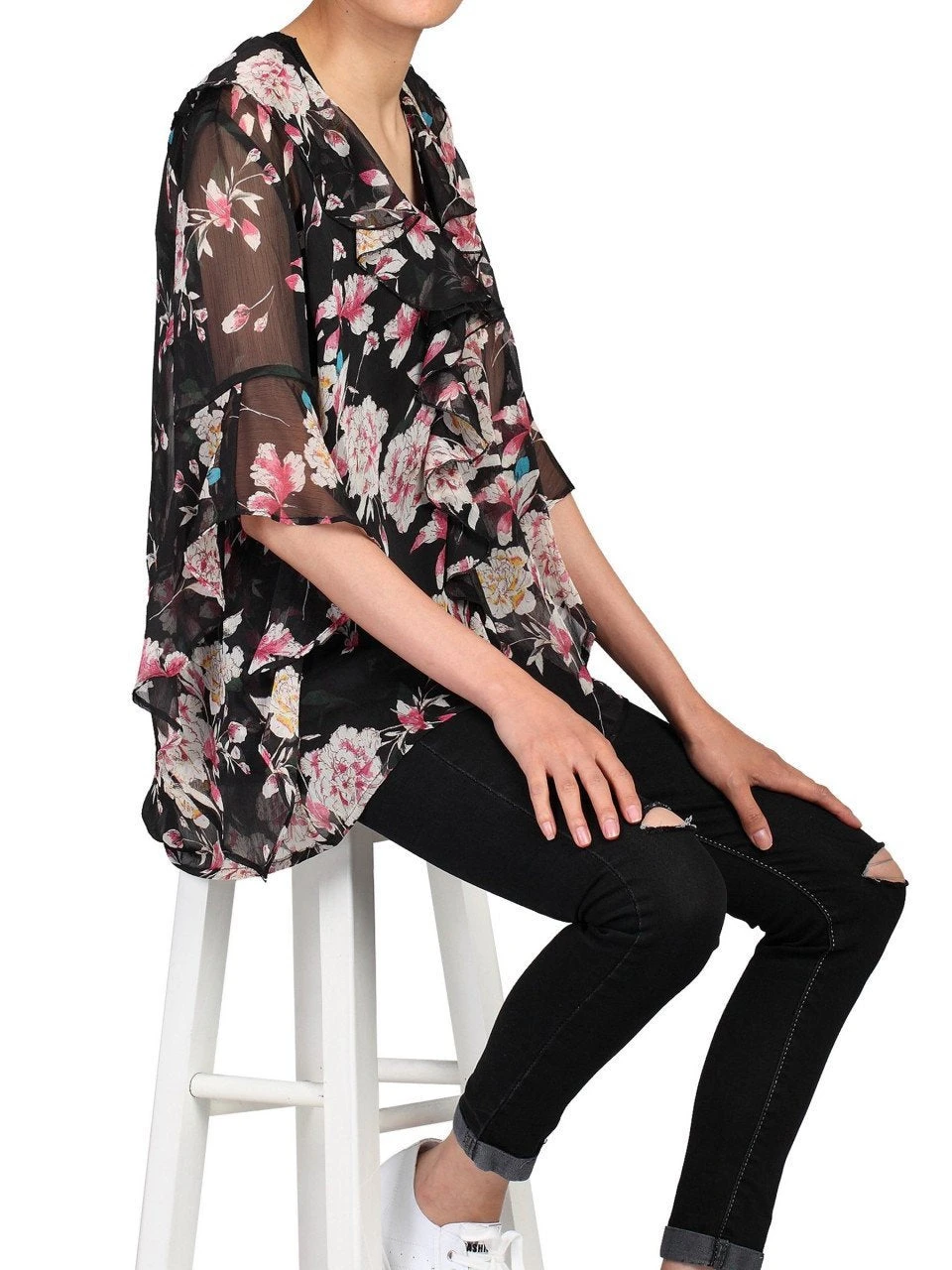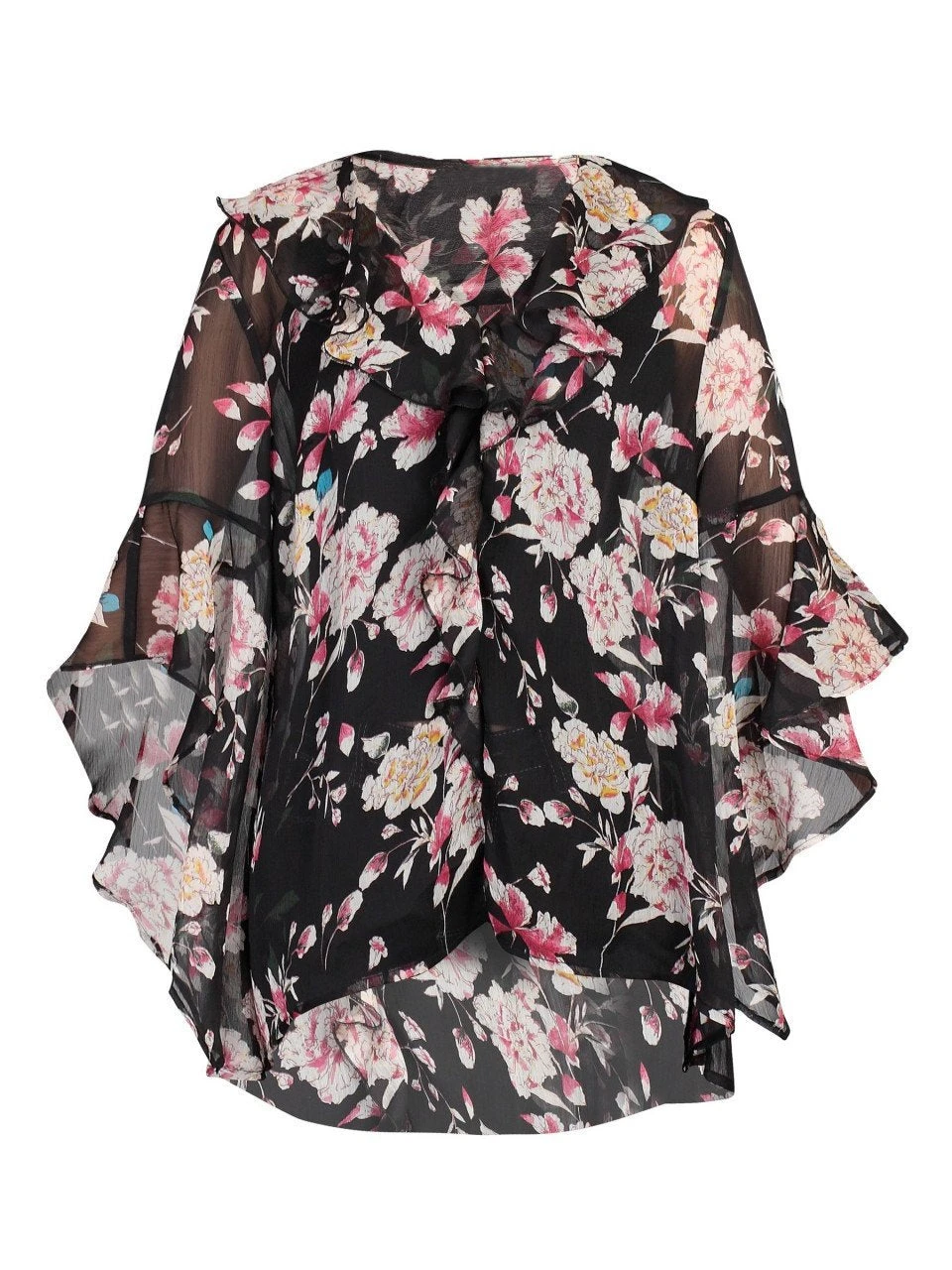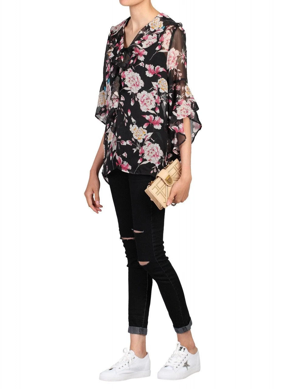 Crafted from a chiffon fabric, this Jolie Moi blouse will feel elegantly delicate on the body. The blouse falls to the hips and features elbow length sleeves adorned with oversized frilled cuffs. An elegant V-neckline with ruffle detailing and a flattering high-low hemline finish the design.