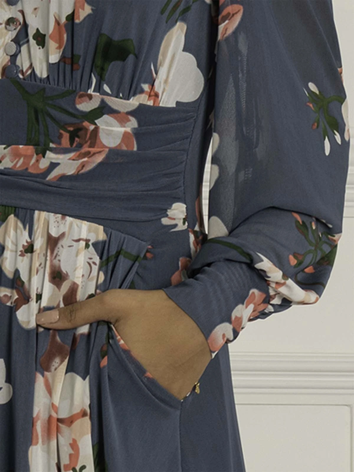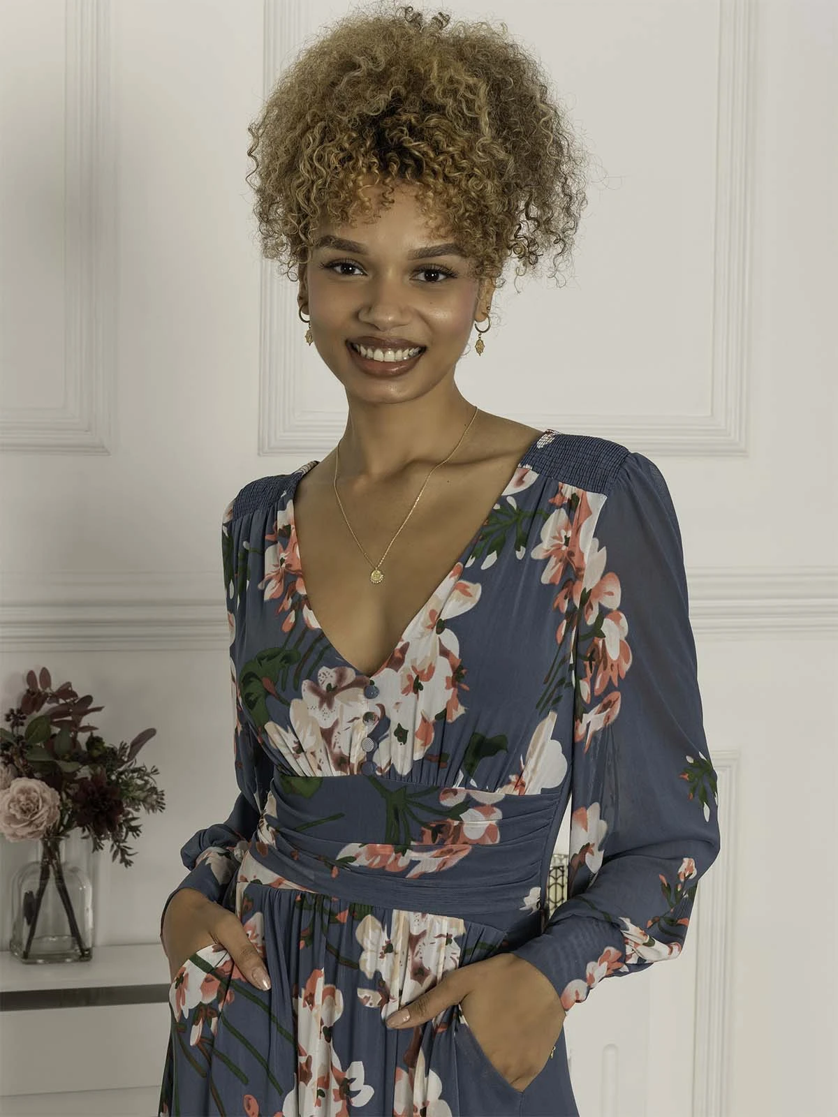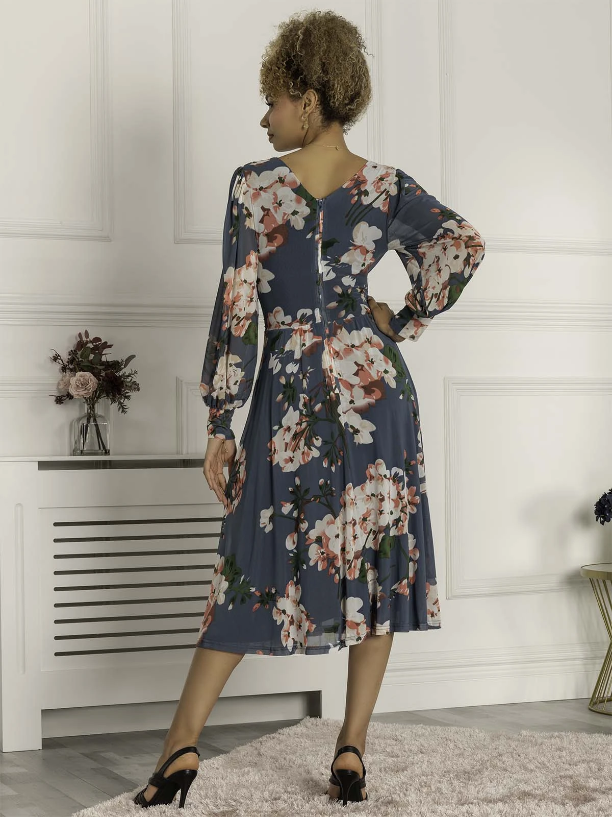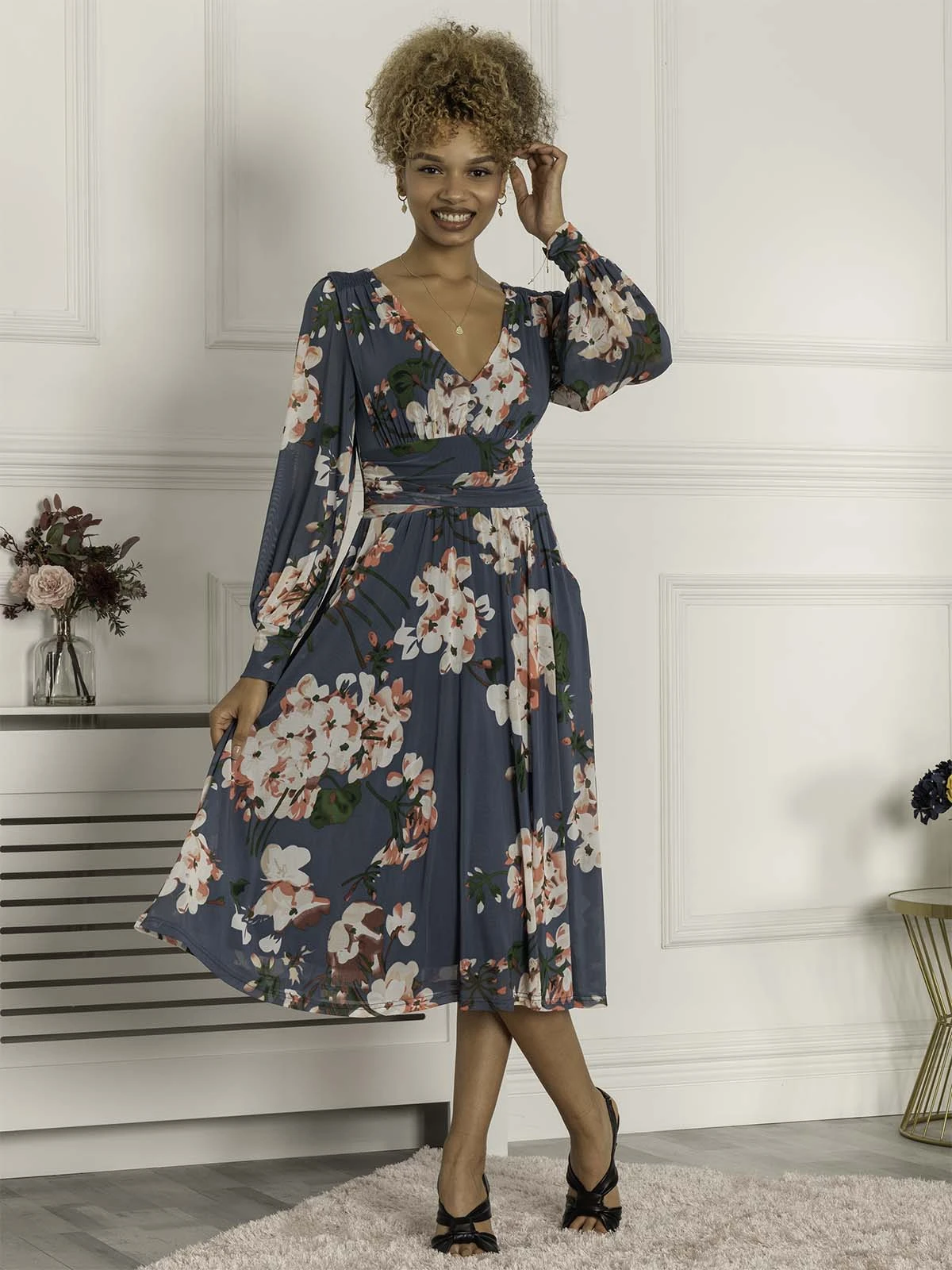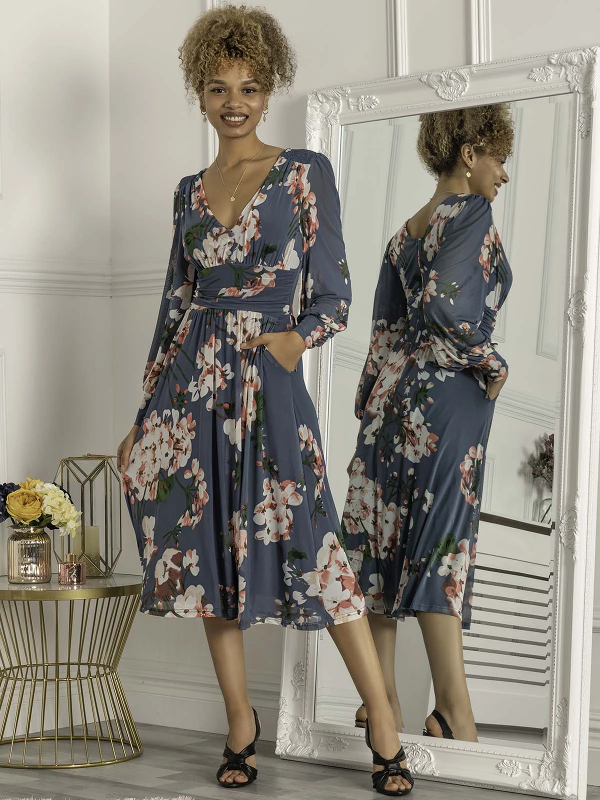Bring a feminine edge to your occasion-wear with this stylish midi dress from Jolie Moi. Beautifully updated with a watercolour floral print, it is made from lightweight knitted non-static mesh fabric that is soft-to-the-touch. With an elegant v-neckline, floaty long sleeves and a flared skirt that falls just below the knee. Pair with heels for your next special event.
