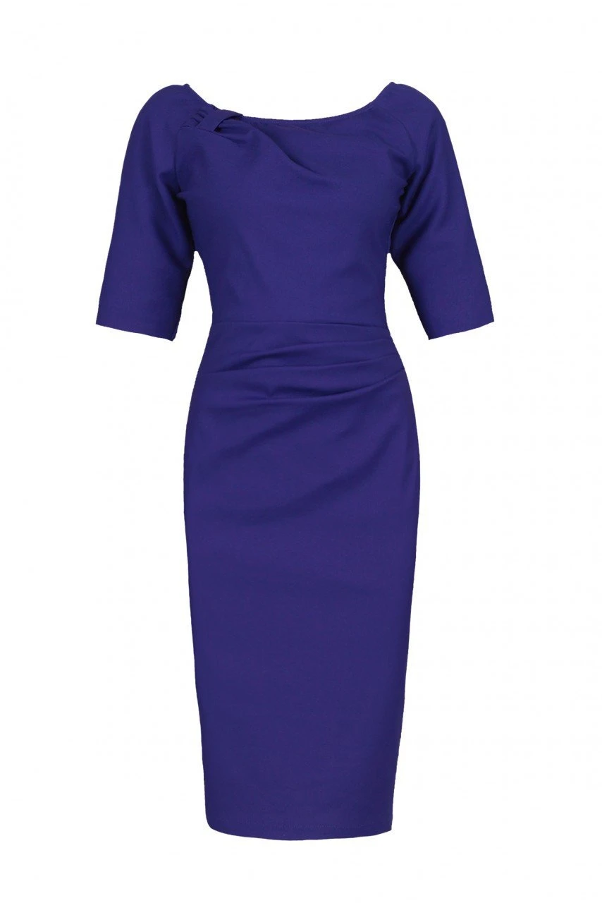 Crafted from a medium weight cotton fabric with a hint of stretch and fully-lined for comfort, it features half-sleeves and a feminine boat neckline. Cut to a demure knee-length, it boasts ruching detail for a form-flattering silhouette and is finished with concealed back zip.