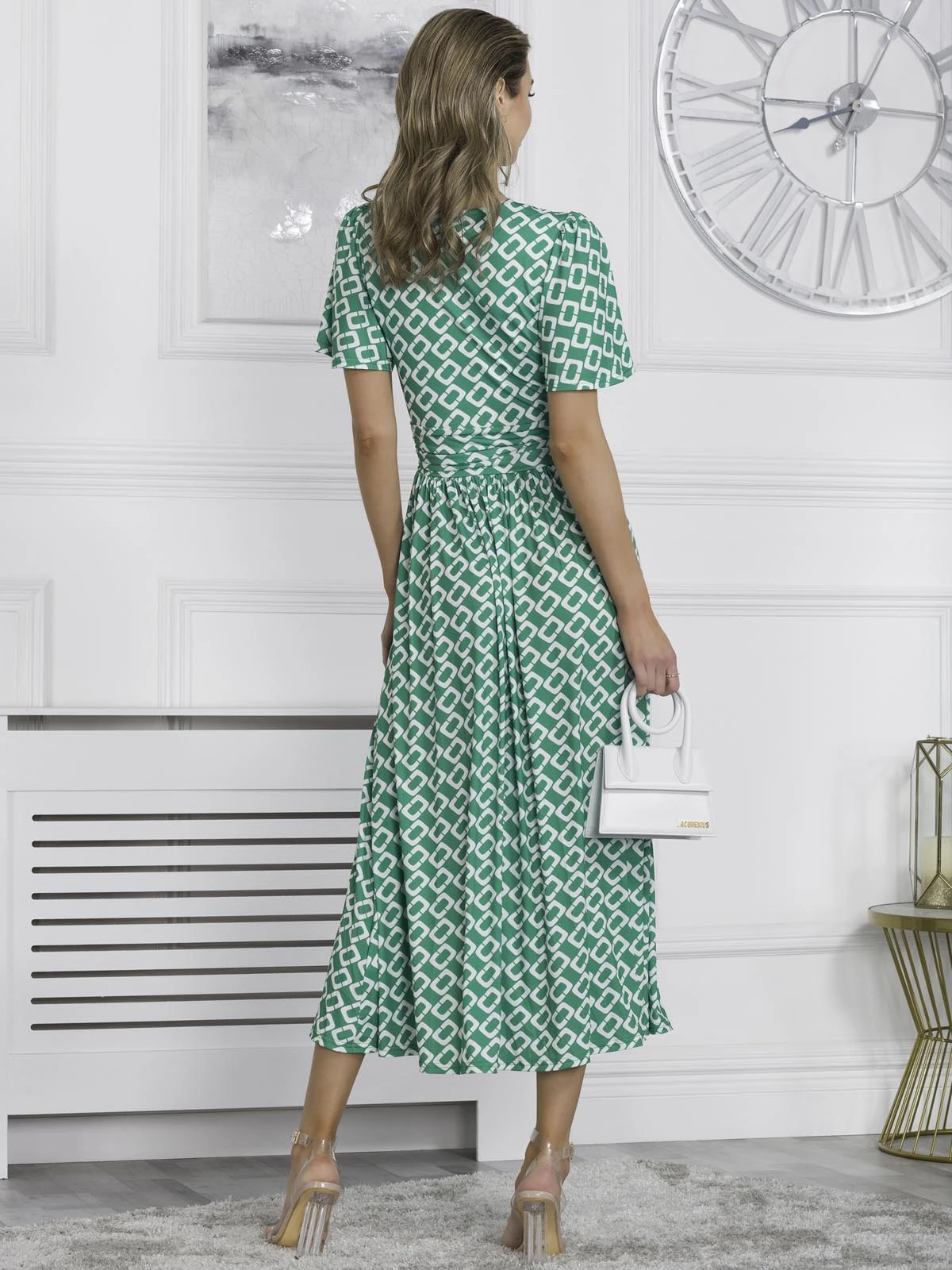 Add a pop of colour to your wardrobe this Spring with the Halley maxi dress. Decorated with an on-trend geometric pattern print. Complimented with a v-neckline, short angel sleeves, and a ruched waistline for a form-fitted silhouette. Made from our signature non-static and crease proof jersey fabric. Simply pair with flats or wedges for the perfect daytime look.