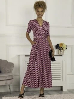 In a refined style that softly drapes and flares out at the hem for added movement, this maxi dress by Jolie Moi is decorated in an eye-catching animal print. Equipped with an elasticated waist to ensure a form-flattering silhouette, completed with a flattering v-neckline and short sleeves, it is made from a soft and fluid blended fabric and is a pretty piece you’ll reach for again and again.