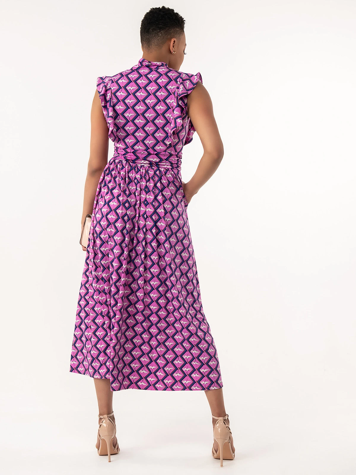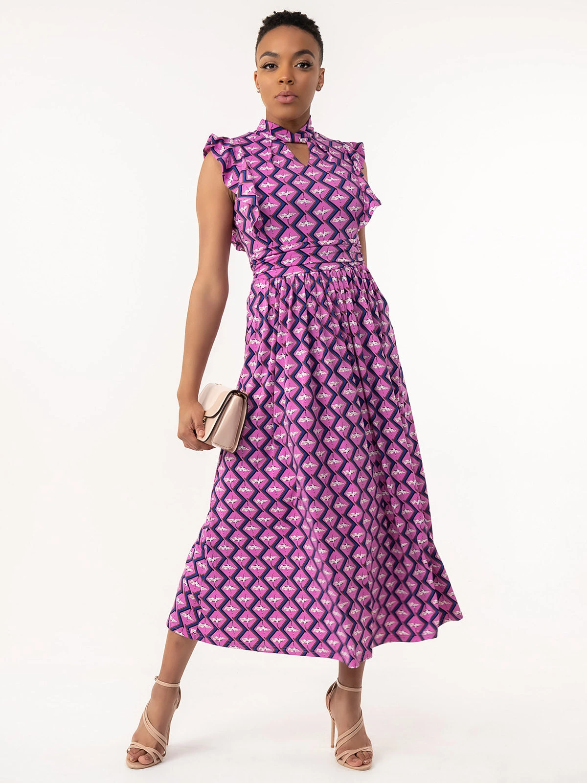 Showcase an elegant bodice and ruffle shoulder detail that we just can’t get enough of. Your go-to print just got better in this Doris dress from Jolie Moi. Made from smooth jersey and cut to a generous fit & flare fit, this printed maxi dress is designed with a smart funnel neck with twisted collar and keyhole cut out detailing at the front . Finished with side pockets for easy wear and a nipped-in ruched waistband to create a smooth shape and falls to the ankle adding an elegant flow. It would be a beautiful choice for a wedding guest outfit or summer socials.Â