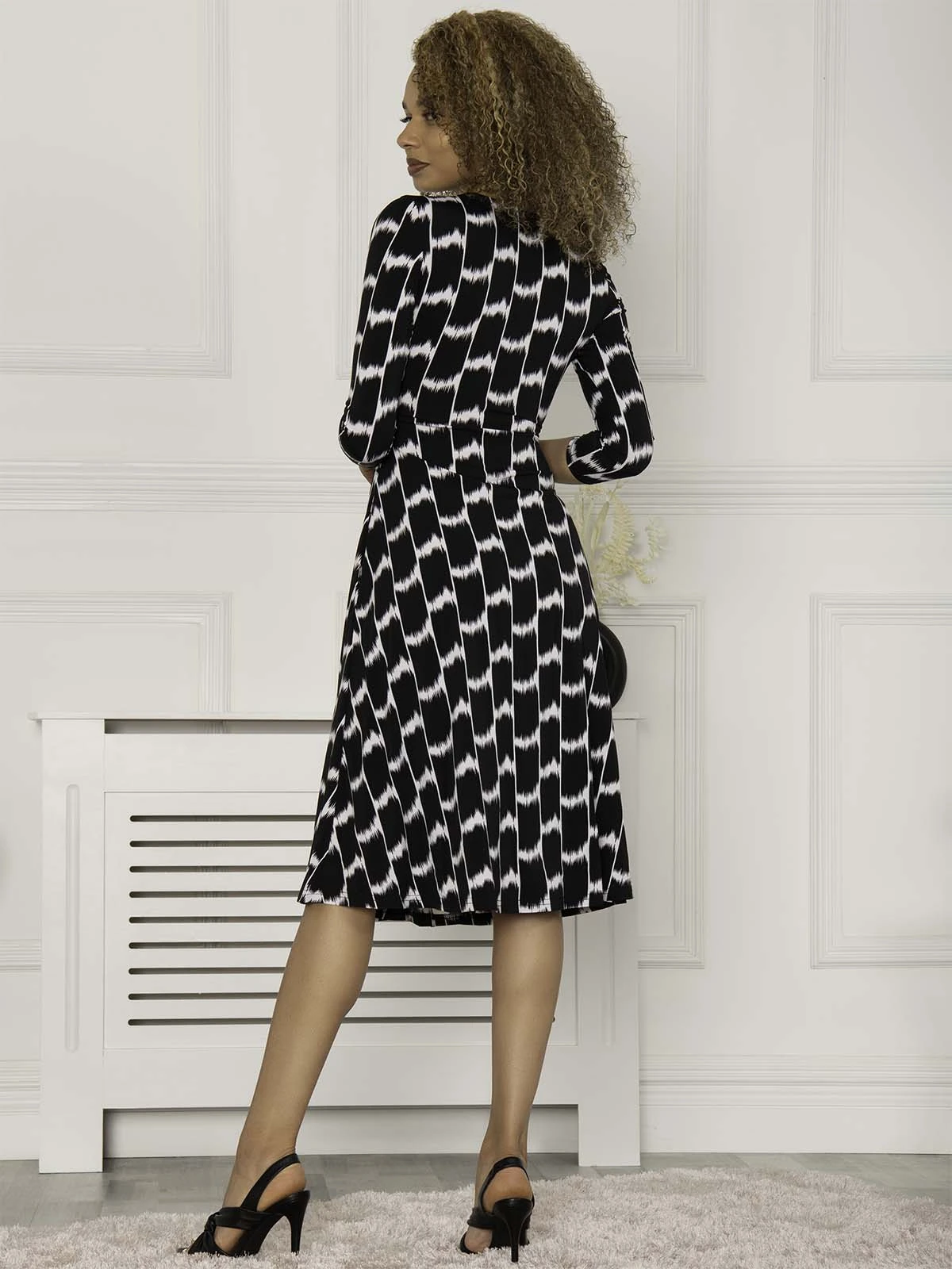Flaring out at the hem for added movement, this knee-length dress by Jolie Moi makes an impact with a bold geometric print. Accentuating the figure with a wrap over front and three-quarter length sleeves, it commands wedged or barely-there heels for a memorable sign-off.