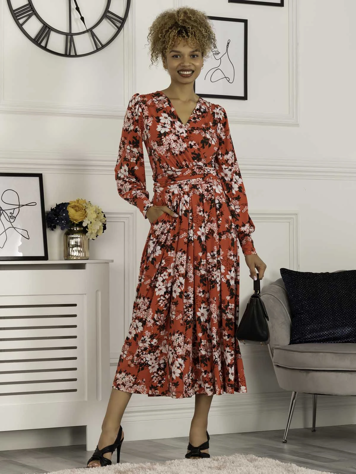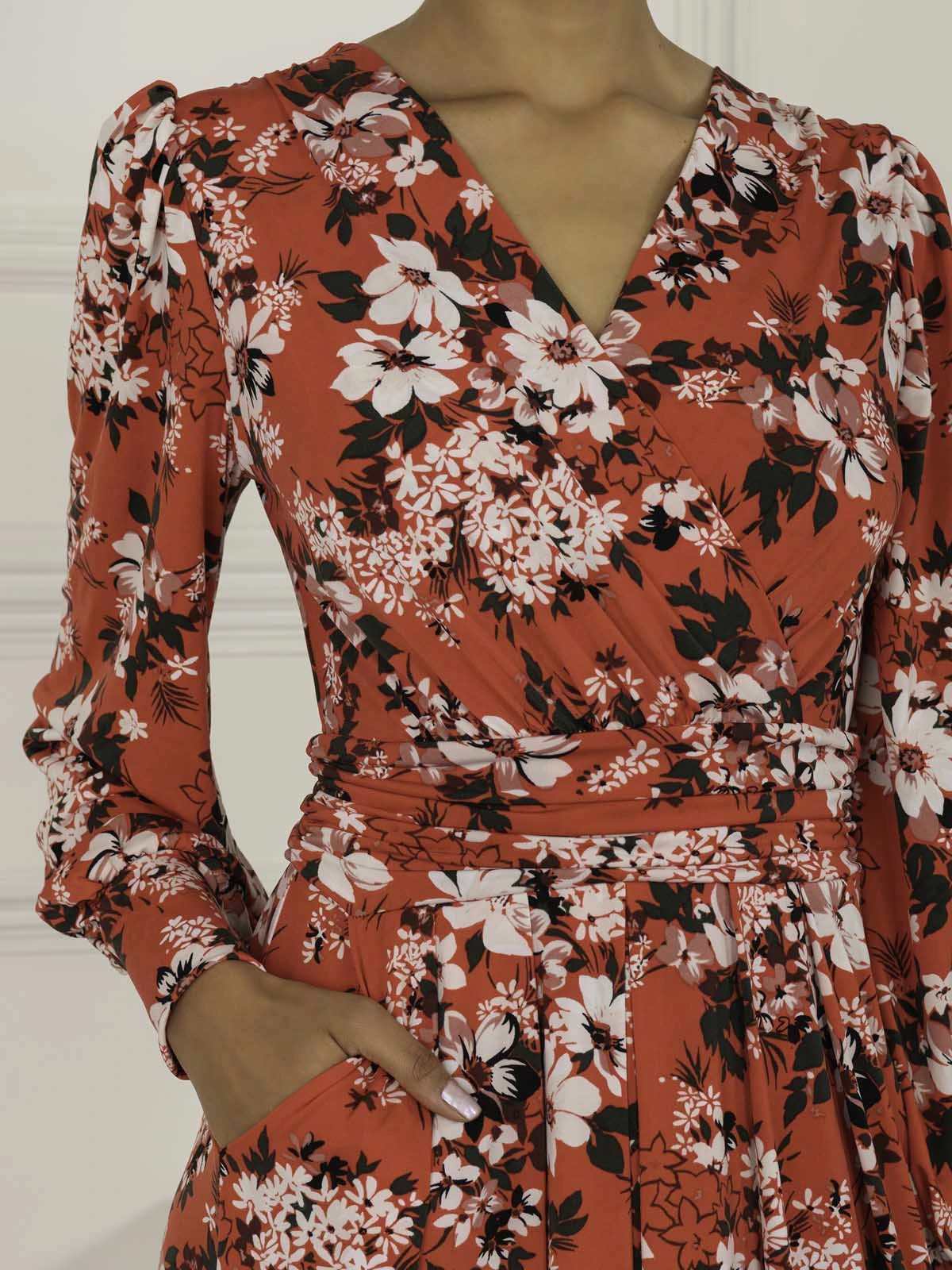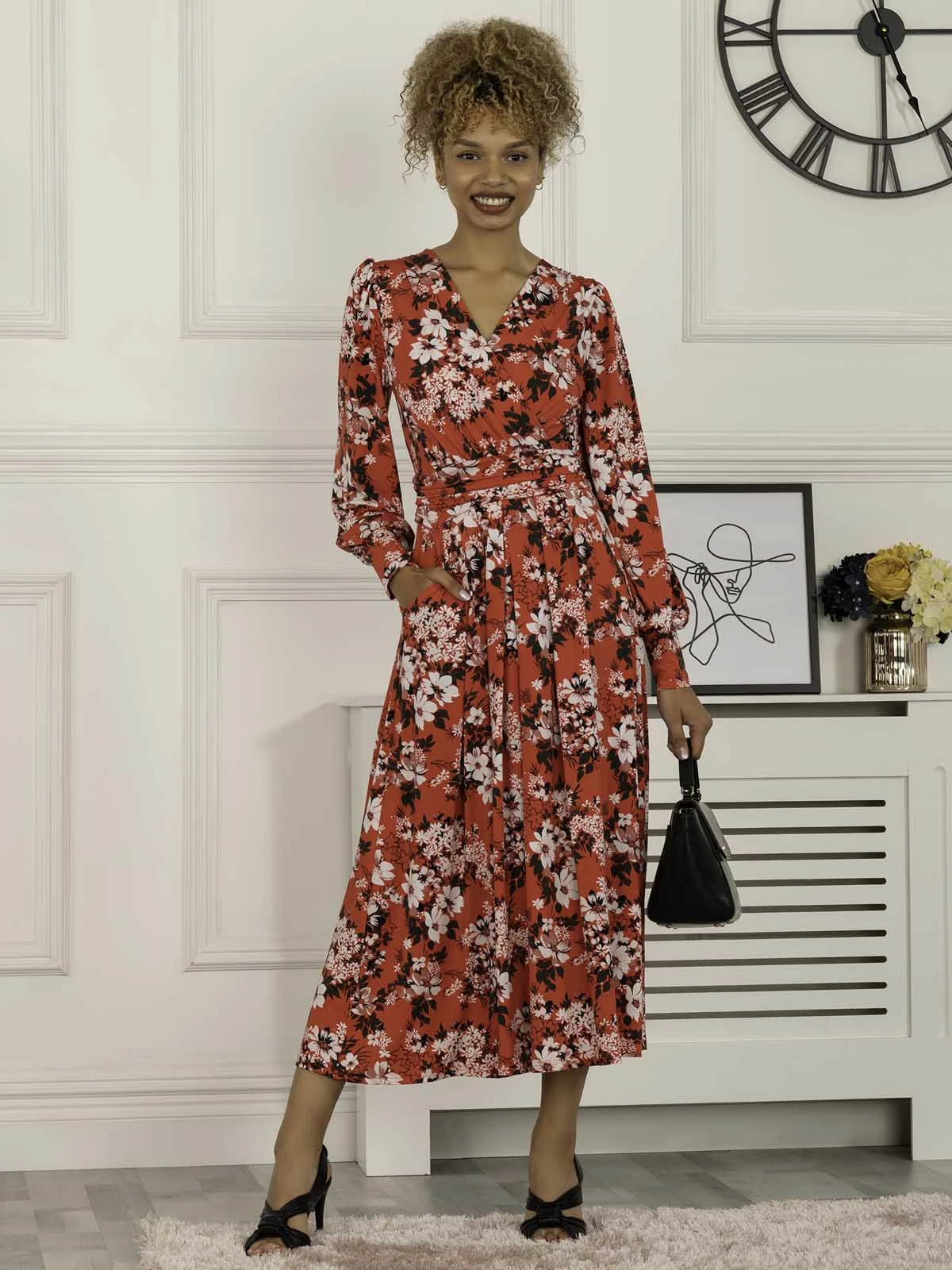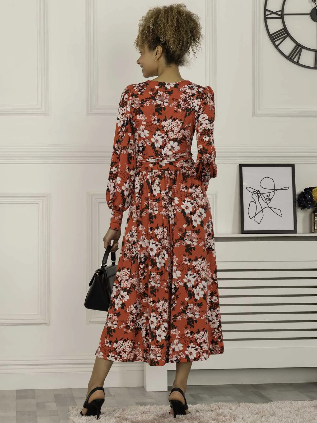 In a timeless wrap silhouette, this printed maxi dress from Jolie Moi is a great day to night option. Framed with a flattering v-neckline and long sleeves, constructed from a mid-weight jersey fabric which fits in all of the right places, the abstract print manages to be bold yet refined, ready for day or night looks. Pairing with heels and statement jewelry for a polished look.