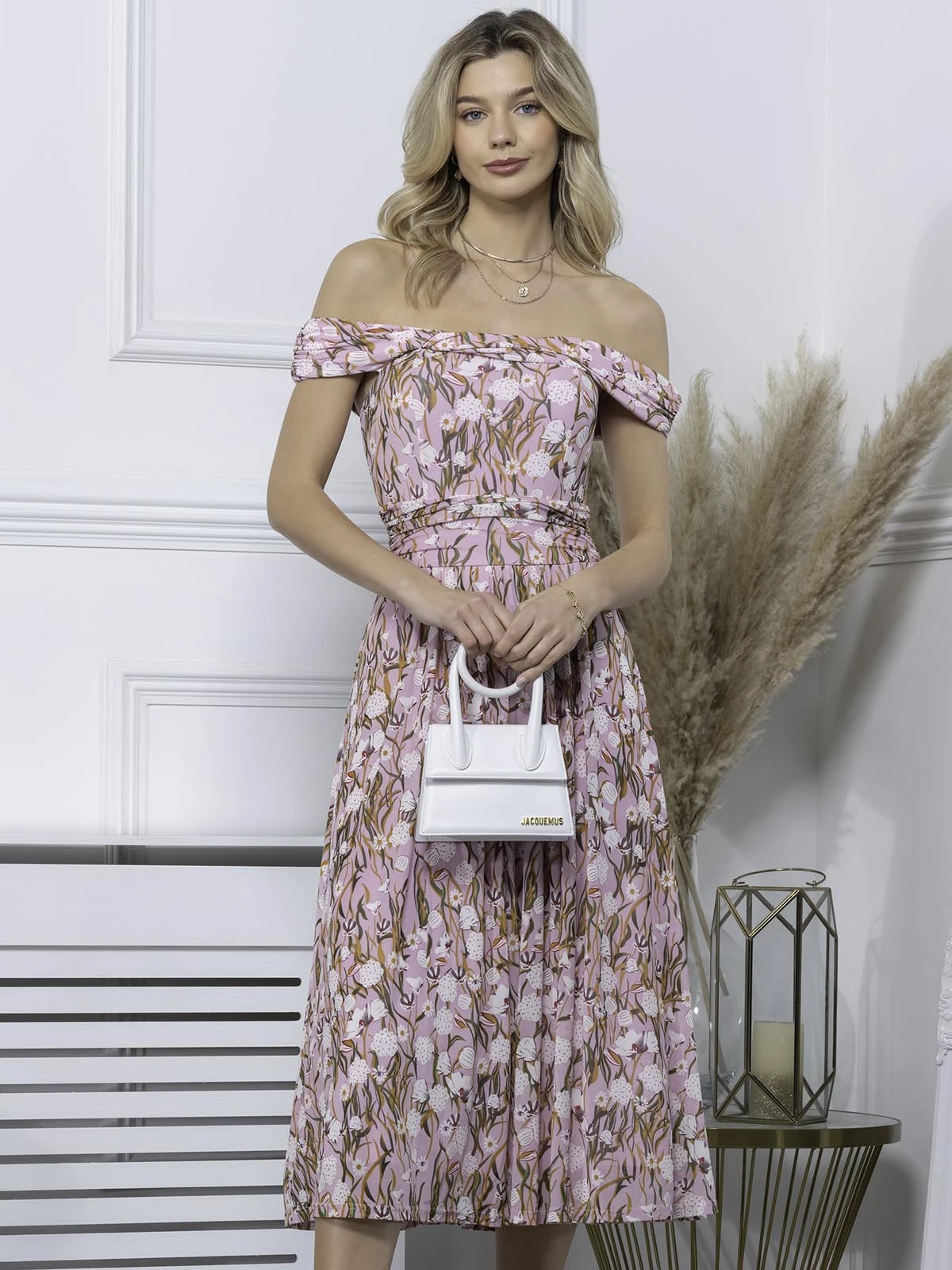 Made from a delicate mesh fabric with an overall floral print and nipped-in at the waist before flaring out through the skirt, this dress sits off the shoulders with an alluring twist Bardot neckline. Fully lined for comfort and finished with a pull on fastening. Wear with metallic strappy heels to dazzle at your next occasion invite.