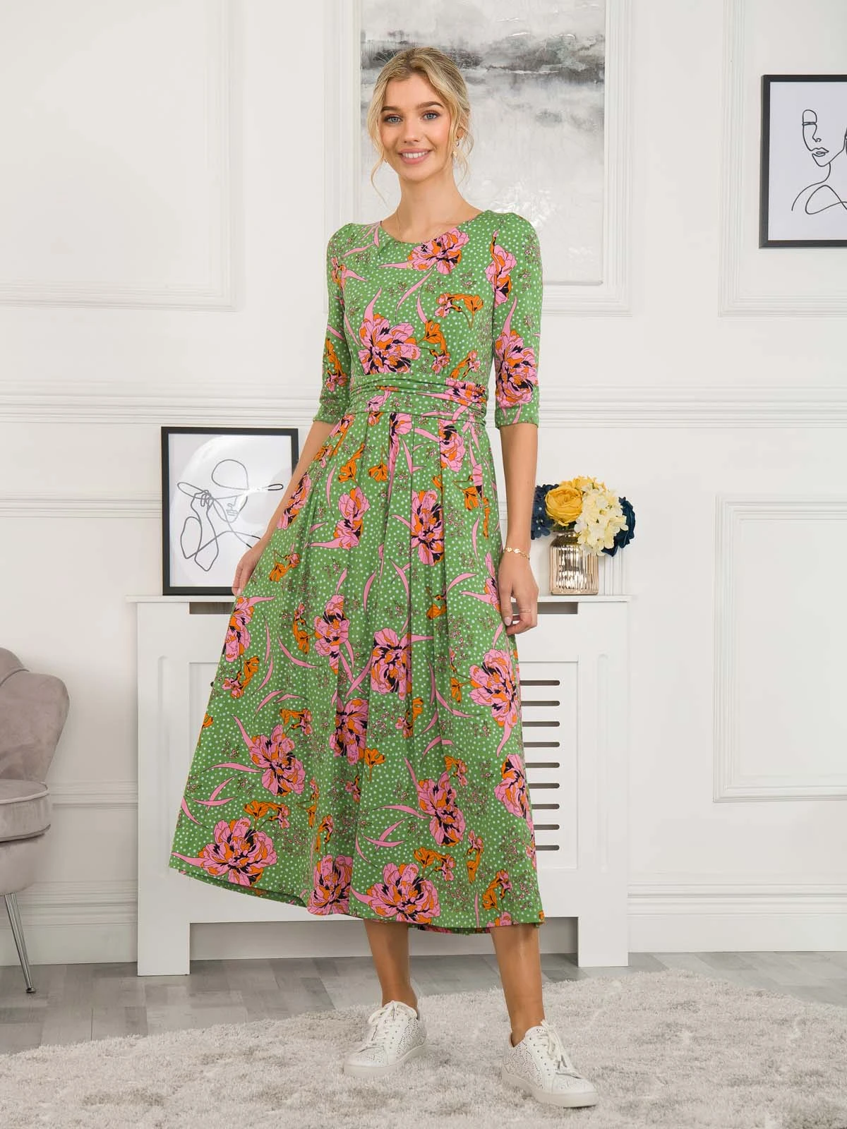Bring a feminine edge to your occasion-wear with the stylish Kimberly maxi dress from Jolie Moi. Covered in a beautiful floral print. Crafted from our signature non-static and crease proof jersey fabric that is soft-to-touch. With an elegant round neckline, elbow length sleeves and a flared skirt that drapes down to the ankle. Match with a pair of trainers or sandals for your next outing.