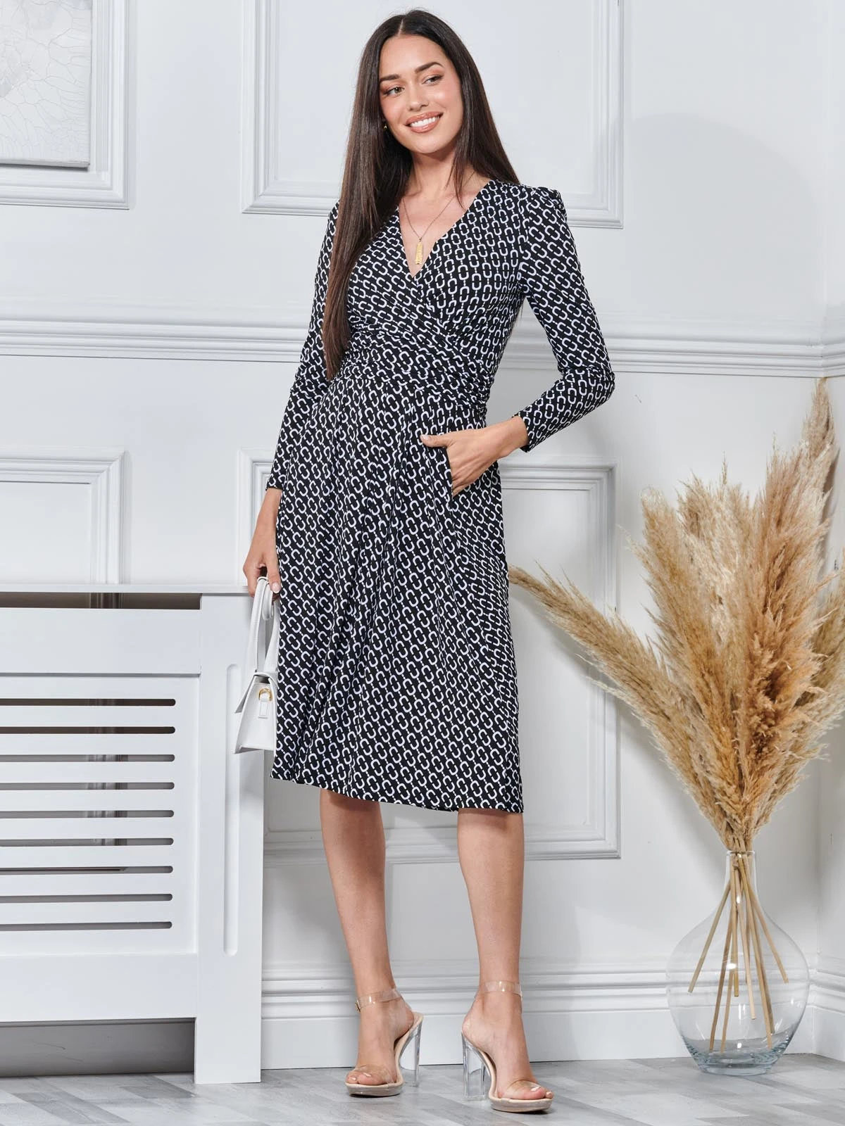 Add contrast to your wardrobe with this versatile bold black geometric pattern print. This dress is made from our stretchy non-static material for all day comfort. Designed with a front wrap v-neck, long sleeves and a tie waist, that flows into a subtle pleated midi hem. Perfect for adding some pattern to your day or night occasions.