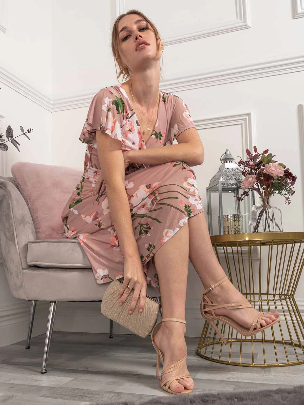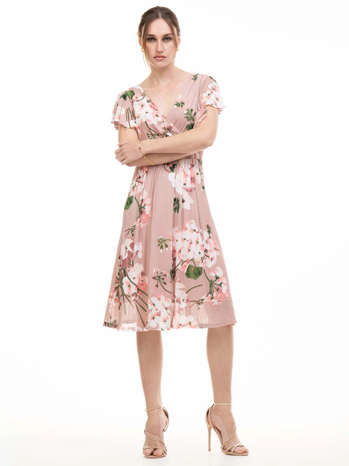 Accentuating the figure with a wrap over front and cap sleeves, it commands wedged or barely-there heels for a memorable sign-off.Â