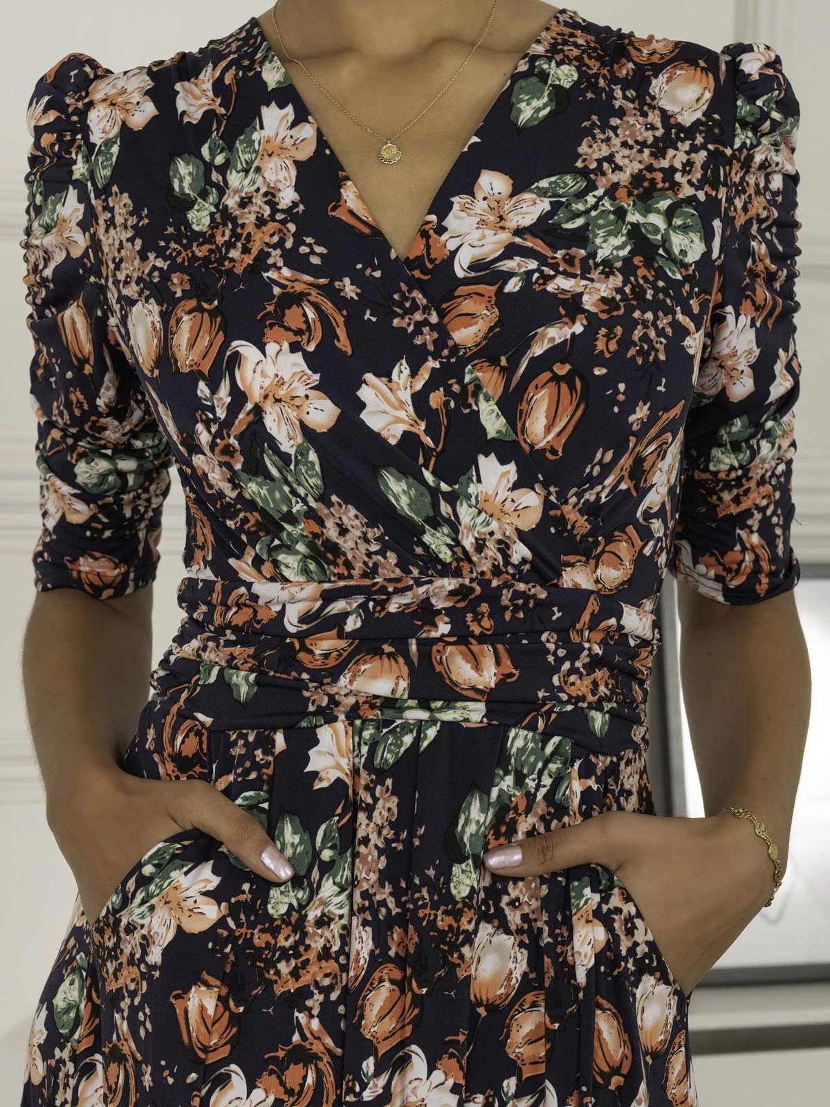 In a flattering fit-and-flare silhouette, the Maanasi Jersey Dress by Jolie Moi is covered with an eye-catching abstract print. The dress features ruched elbow length sleeves, a wrap over v-neck line and an elegant high low hem line. Constructed from a soft non-static and crease proof jersey fabric. Perfect for a night out with the girls. Match with a pair of heels to complete the look.