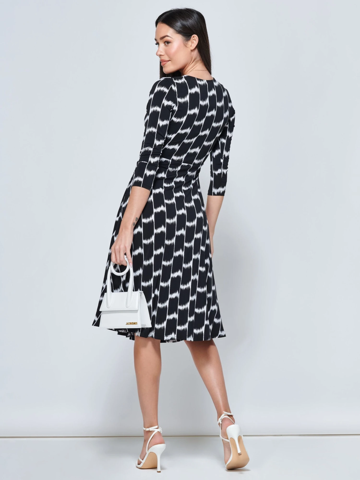 Jump into the light and breezy Odilla midi dress from Jolie Moi. Covered in a striking geometric pattern print, the Odilla features a ruched elasticated waistband for a form-flattering silhouette, 3/4 cropped sleeves and 2 side pockets. Crafted from our signature non-static and crease-proof fabric.Â