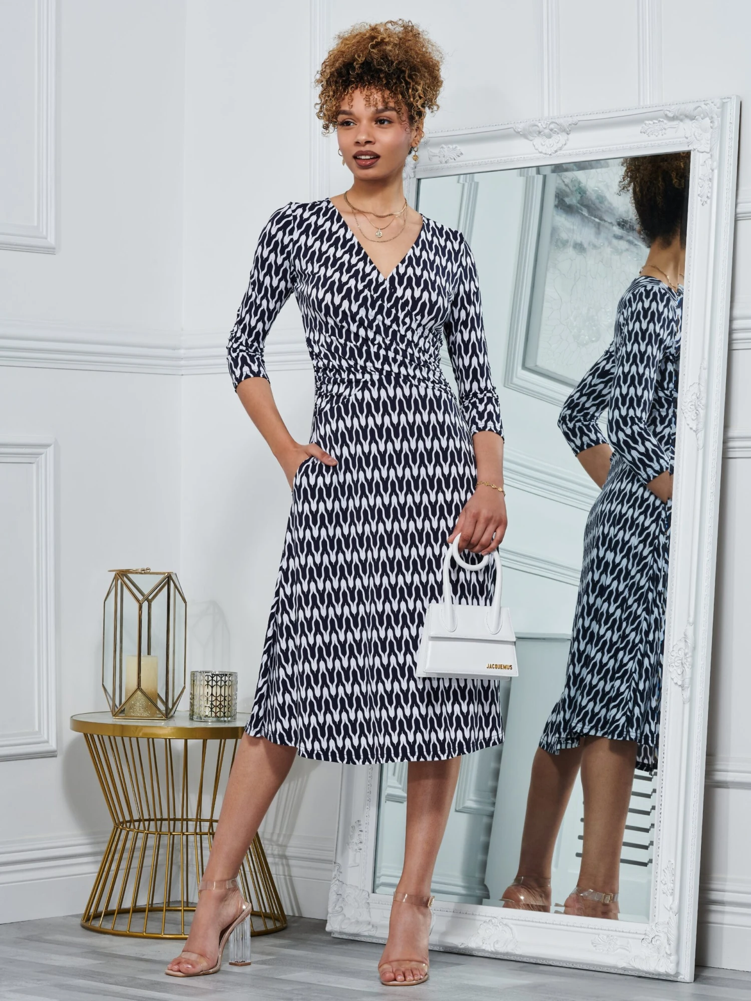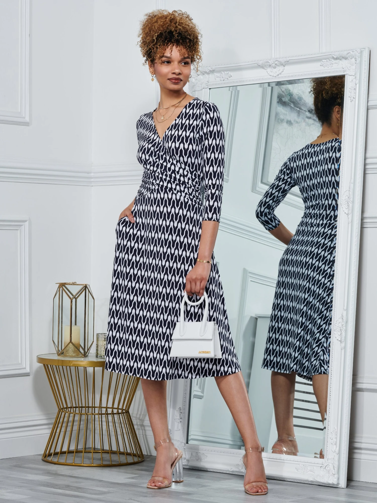 Jump into the light and breezy Odilla midi dress from Jolie Moi. Covered in a striking geometric pattern print, the Odilla features a ruched elasticated waistband for a form-flattering silhouette, 3/4 cropped sleeves and 2 side pockets. Crafted from our signature non-static and crease-proof fabric.Â