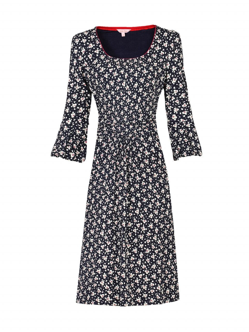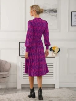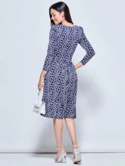 Crafted from a soft viscose blend stretchy jersey fabric, this design features a flattering boat neckline and an all over eye-catching retro pattern print. It is bound to win complements with its trendy 3/4 length balloon sleeve design and demure appeal making this dress suitable for work or weekend.