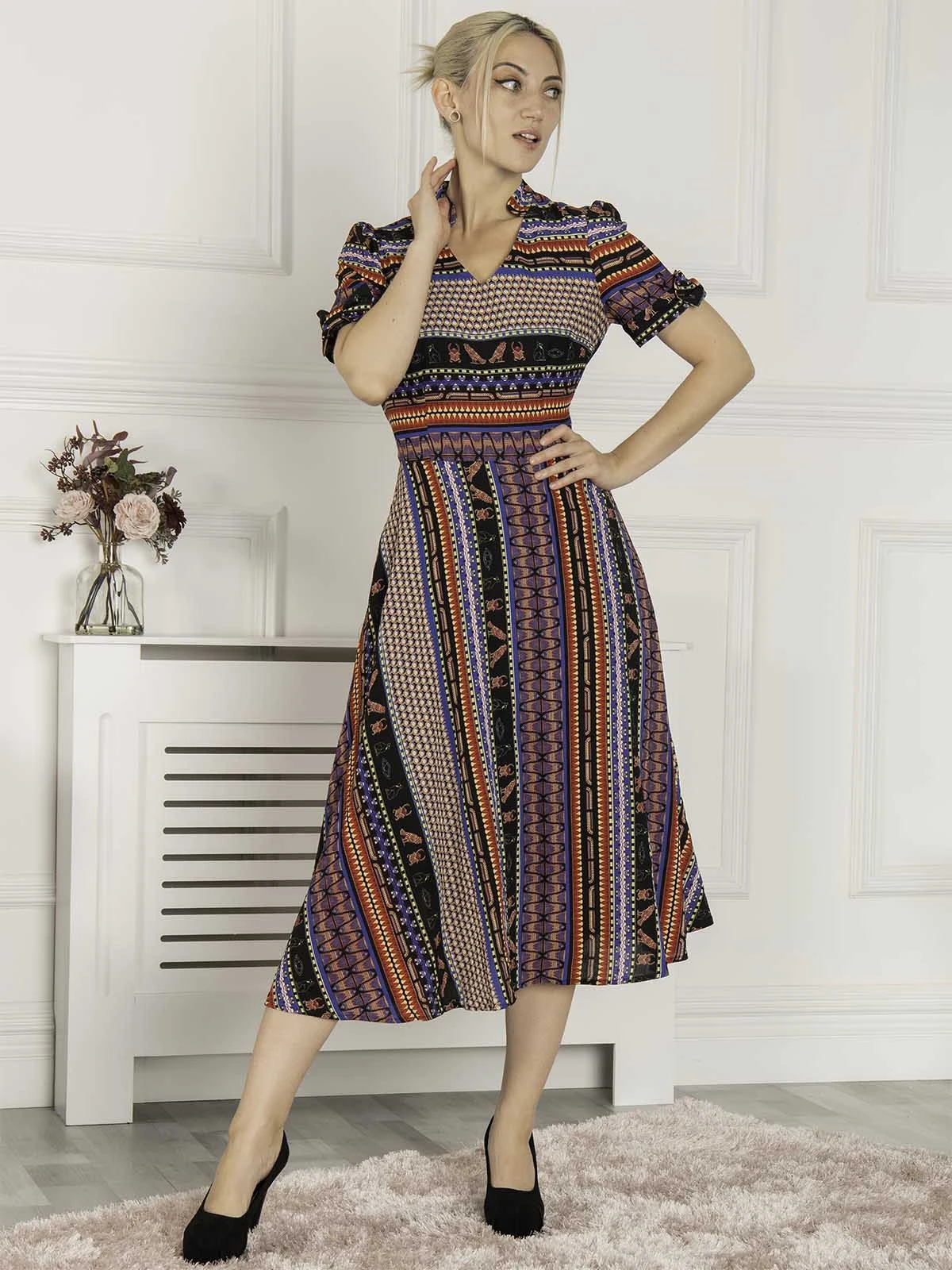 Made from a lightweight and flowy fabric with vibrant patterns and colours, this item features a V-neck with stand collar, short sleeves with a bow detail, a concealed zip fastening down the back and side pockets for added function. An added waist tie helps contour it to your shape for a flattering silhouette.Â