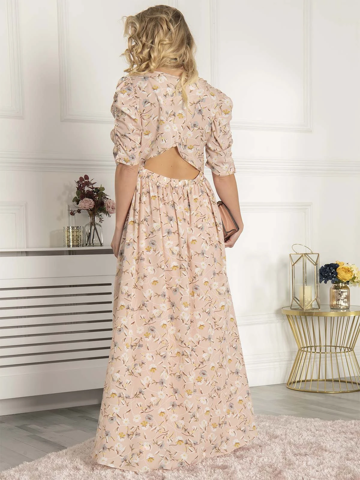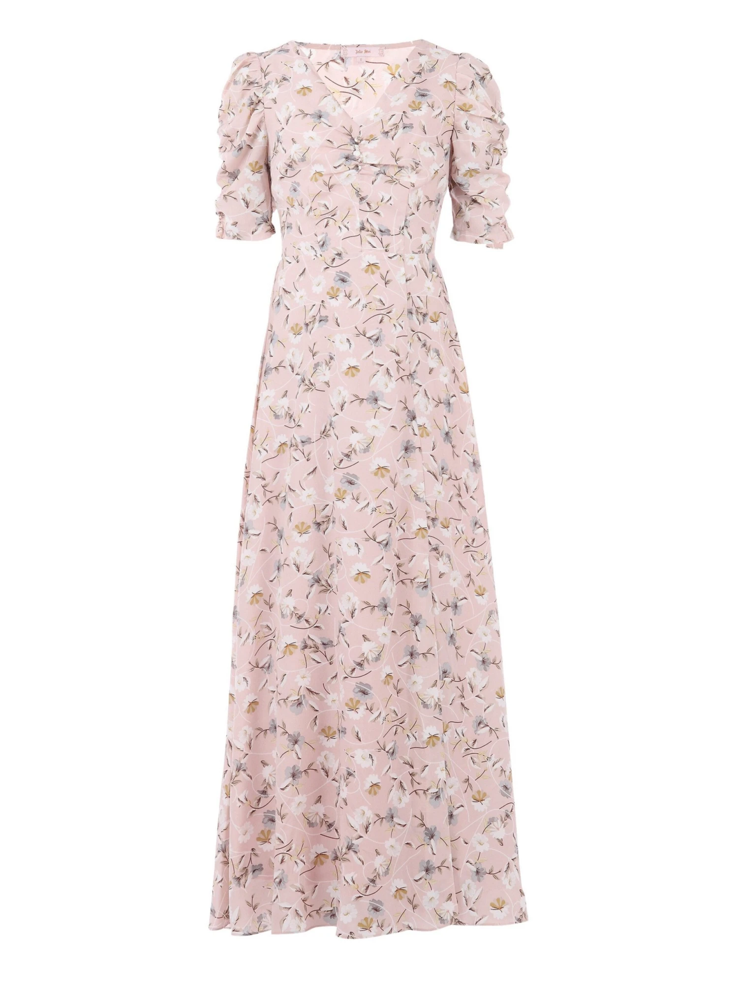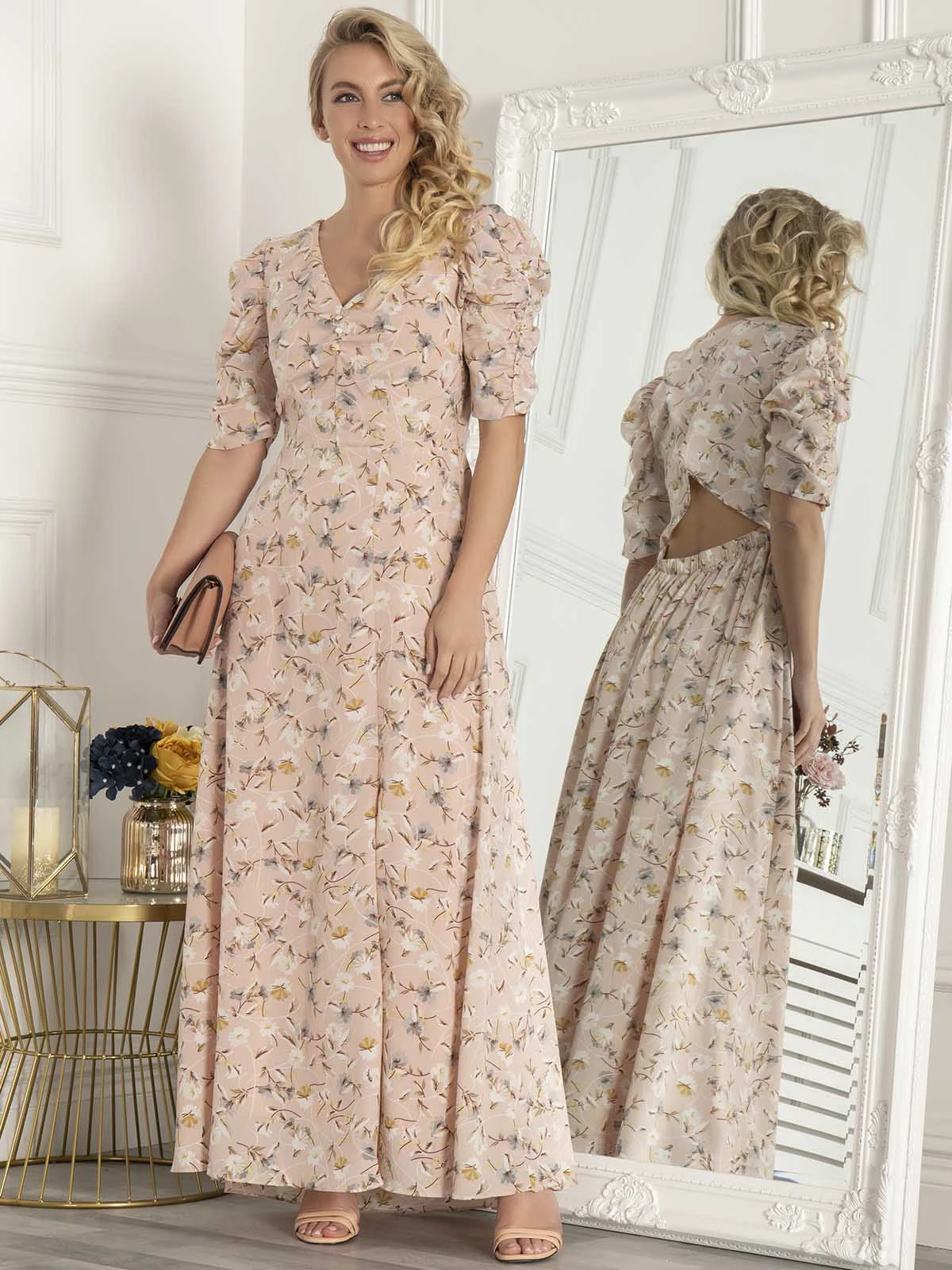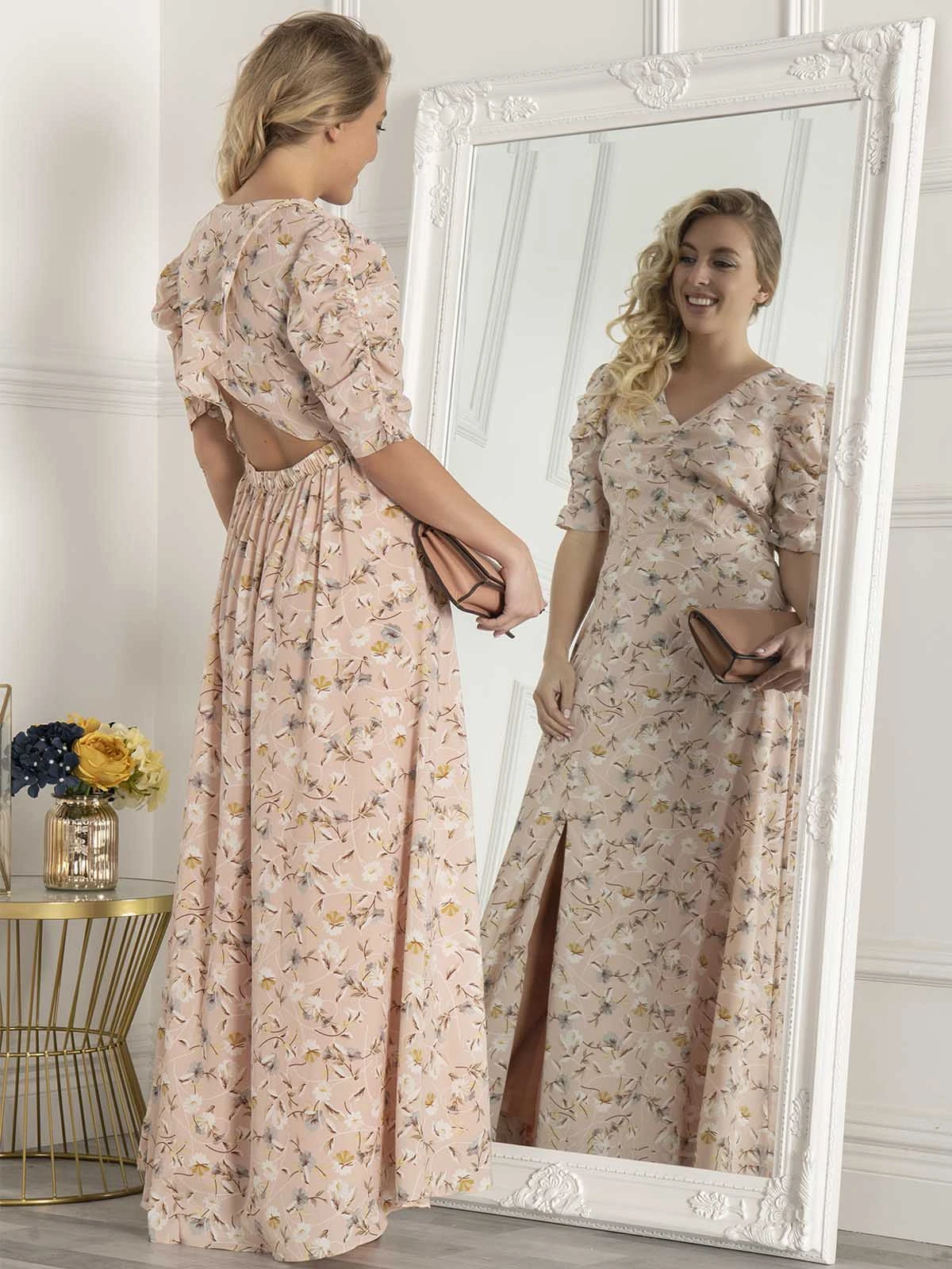 With its flowing, feminine fit and vintage-inspired details, this maxi dress from Jolie Moi is ideal for warm-weather occasion dressing. Crafted from lightweight crepe with an all-over pretty floral print, it features a flattering V neckline and strategically placed fabric covered buttons along the front. Its striking open back, exaggerated puff sleeves and front split keep it feeling contemporary.
