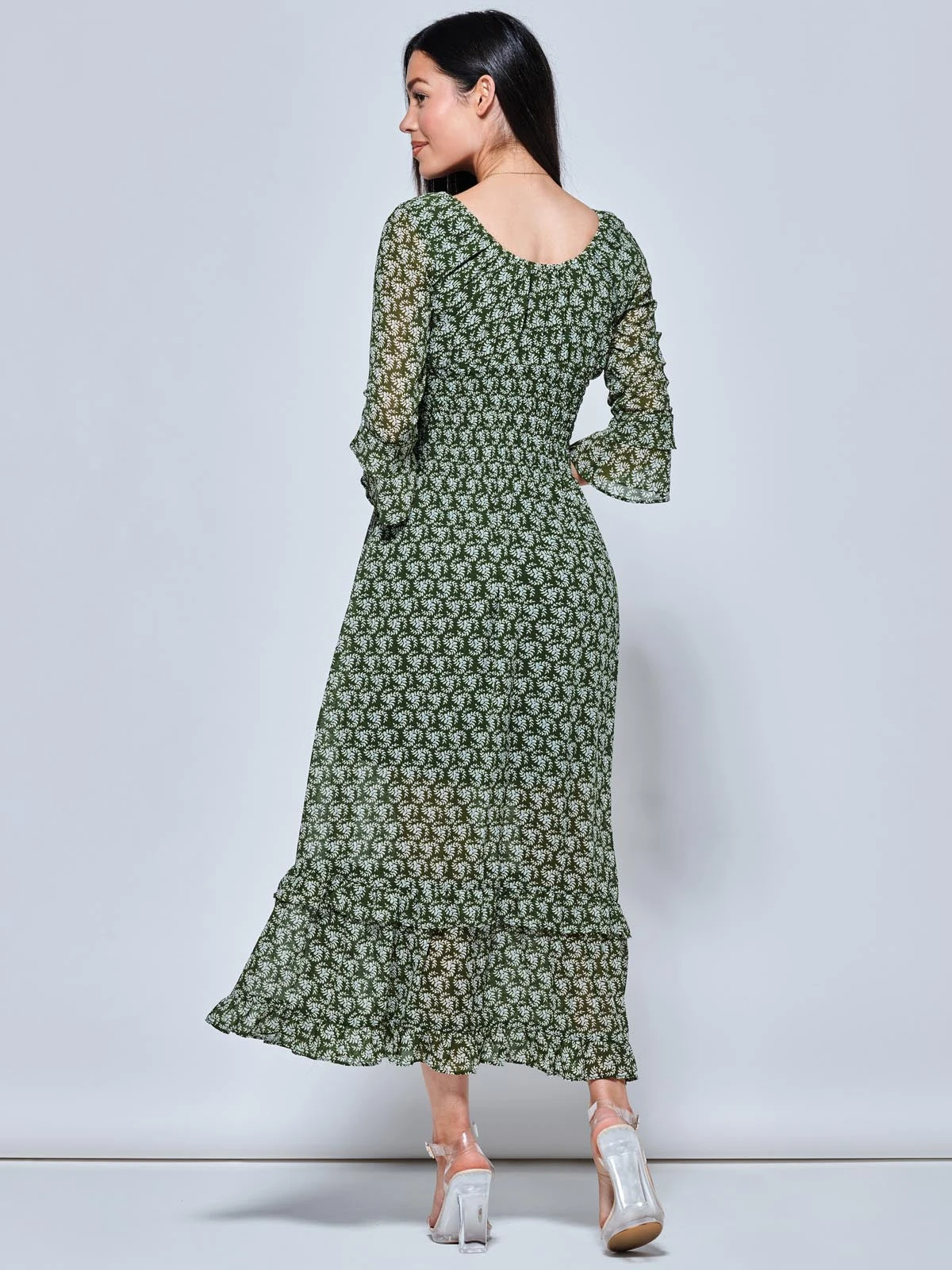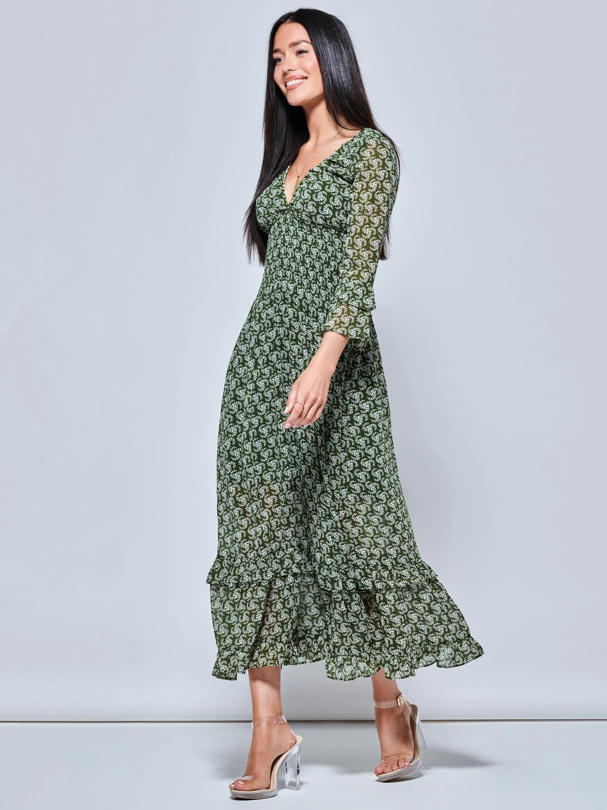 Whether you are on holiday or at your next summer event, Jolie Moi has you covered. This light and airy chiffon dress is decorated with a floral print, and complimented by a v-neckline, tiered sleeves and hem, and a ruched waistline that cinches in at the waist for a form flattering silhouette. Day or night, this dress is the perfect addition to any fashion forward wardrobe.