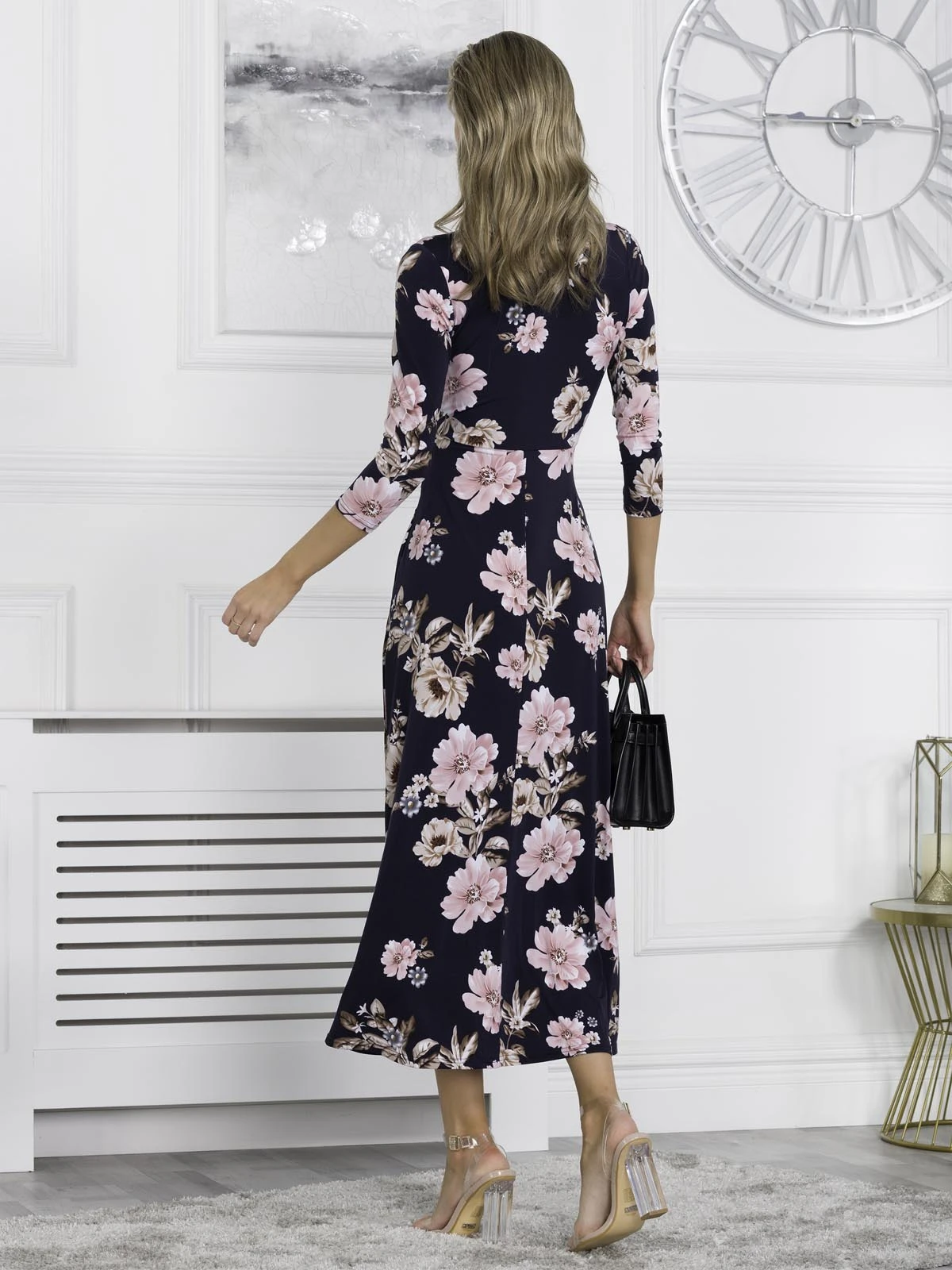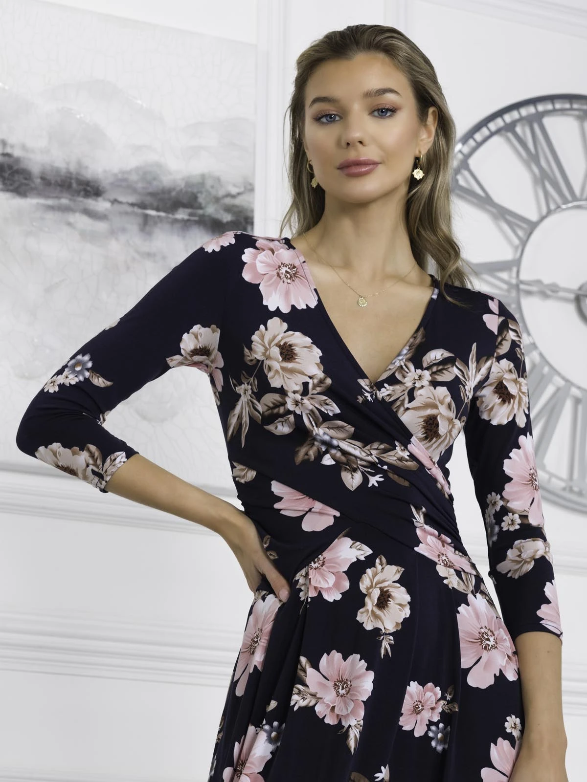 Dress to impress with the Quintella maxi dress. Covered from head to toe in a gorgeous floral print. Crafted from our lightweight non-static and crease-proof jersey fabric. Complemented by a deep wrap over v-neckline, ruched centre that flares out at the hem, and long 3/4 length sleeves.