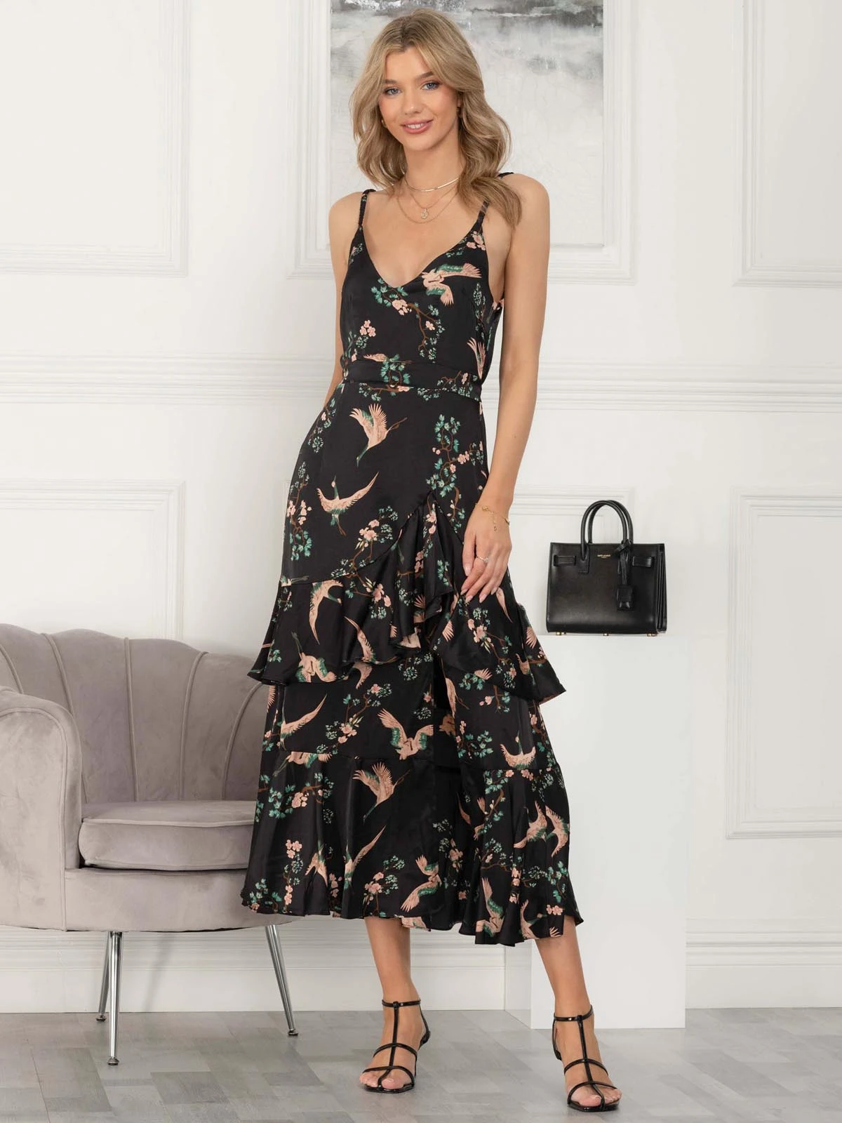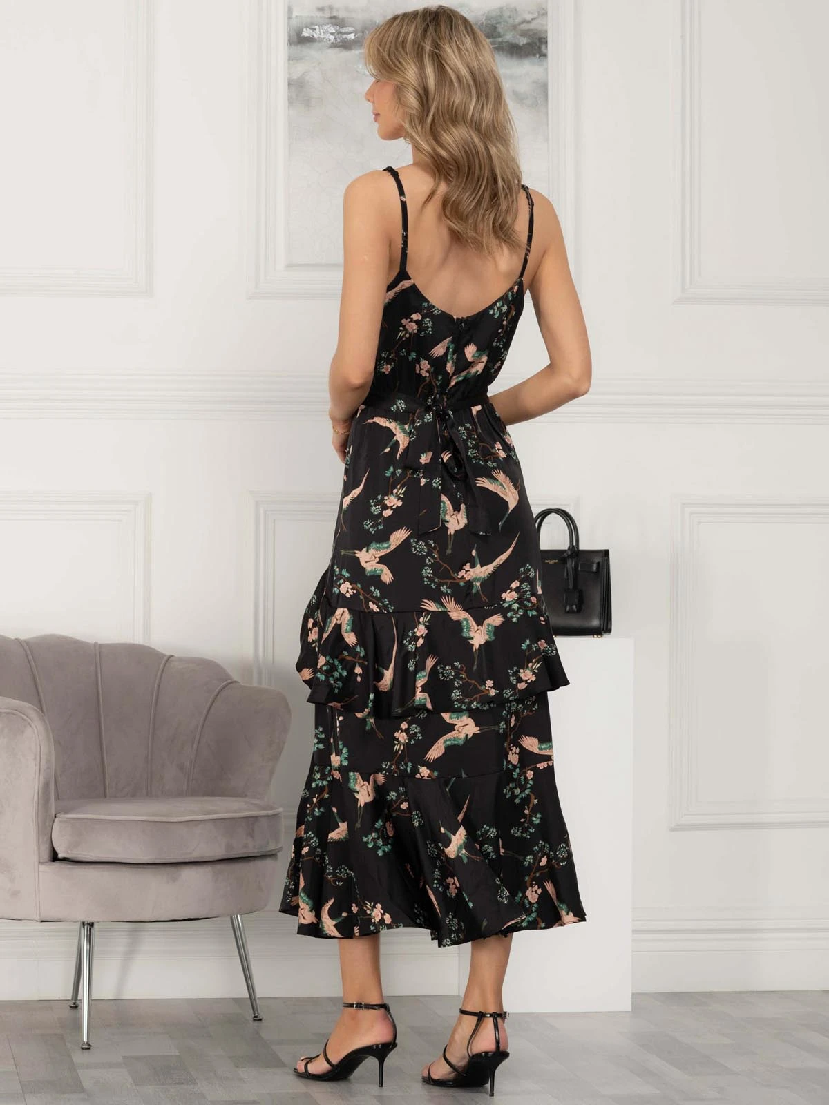 Stylish and sleek, our versatile retro satin maxi dress will take you from daytime chic to night-on-the-town glam. Designed with a luxurious bird print, this sleeveless dress features an adjustable fastening at the shoulders, and a self-tie waist for a comfortable yet flattering fit whatever the time of day or night.