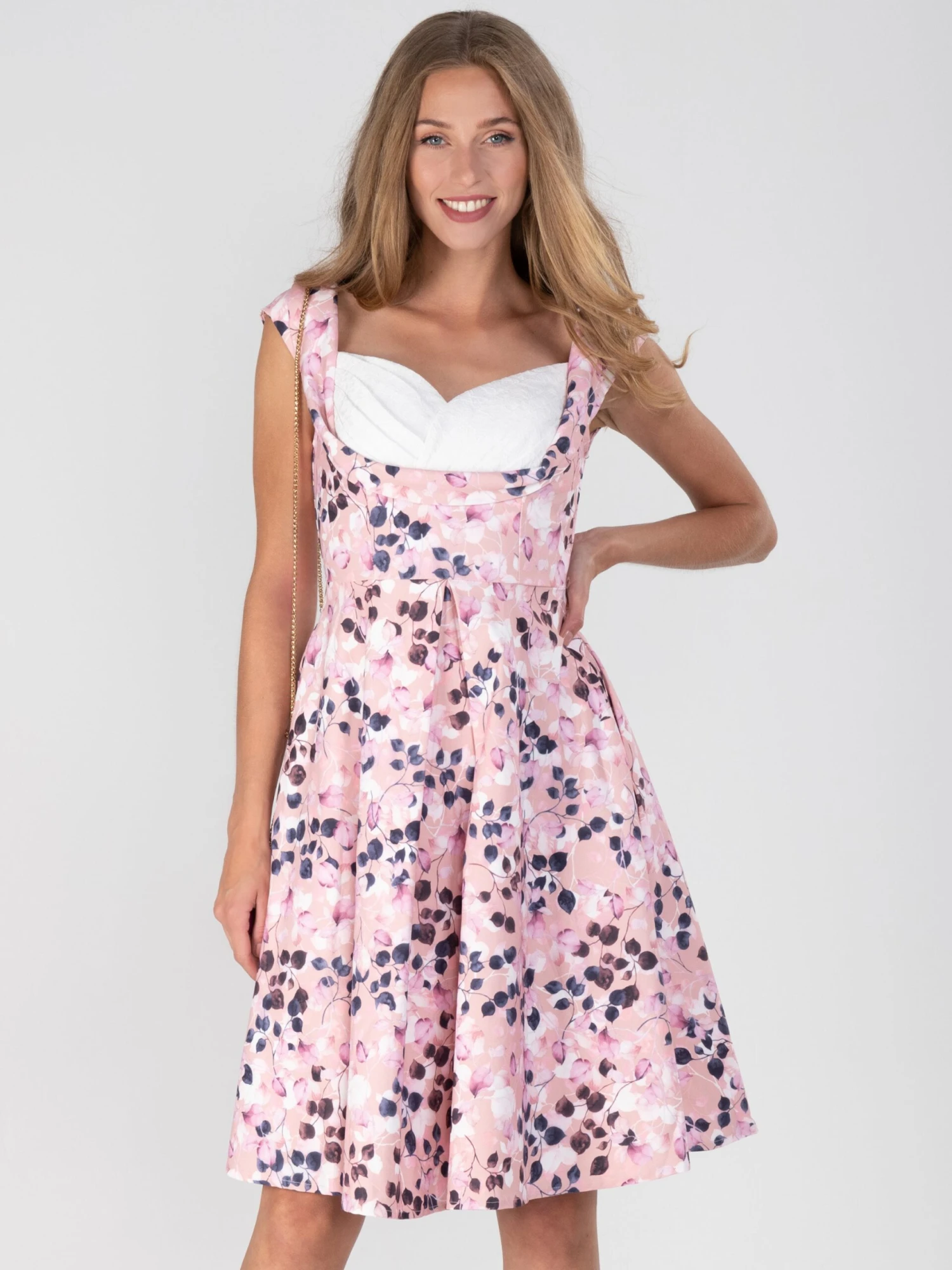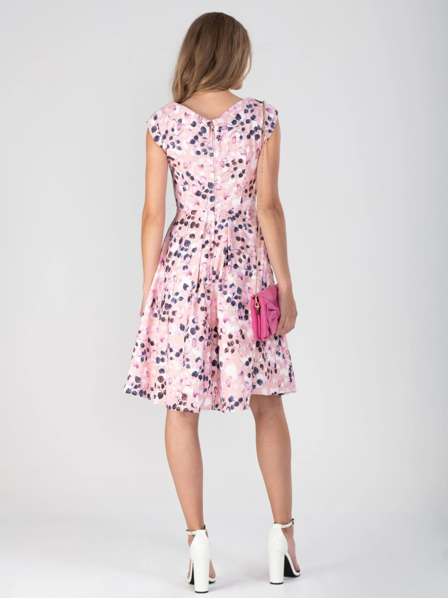 Pink floral print crossover bust swing dress. Team with sling back heels and a clutch for an effortlessly chic ensemble.