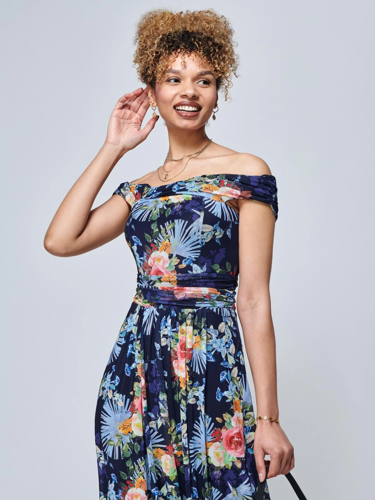 Made from a delicate mesh fabric with an overall floral print and nipped-in at the waist before flaring out through the skirt, this dress sits off the shoulders with an alluring twist Bardot neckline. Fully lined for comfort and finished with a pull on fastening. Match with a pair of strappy heels to dazzle at your next occasion invite.