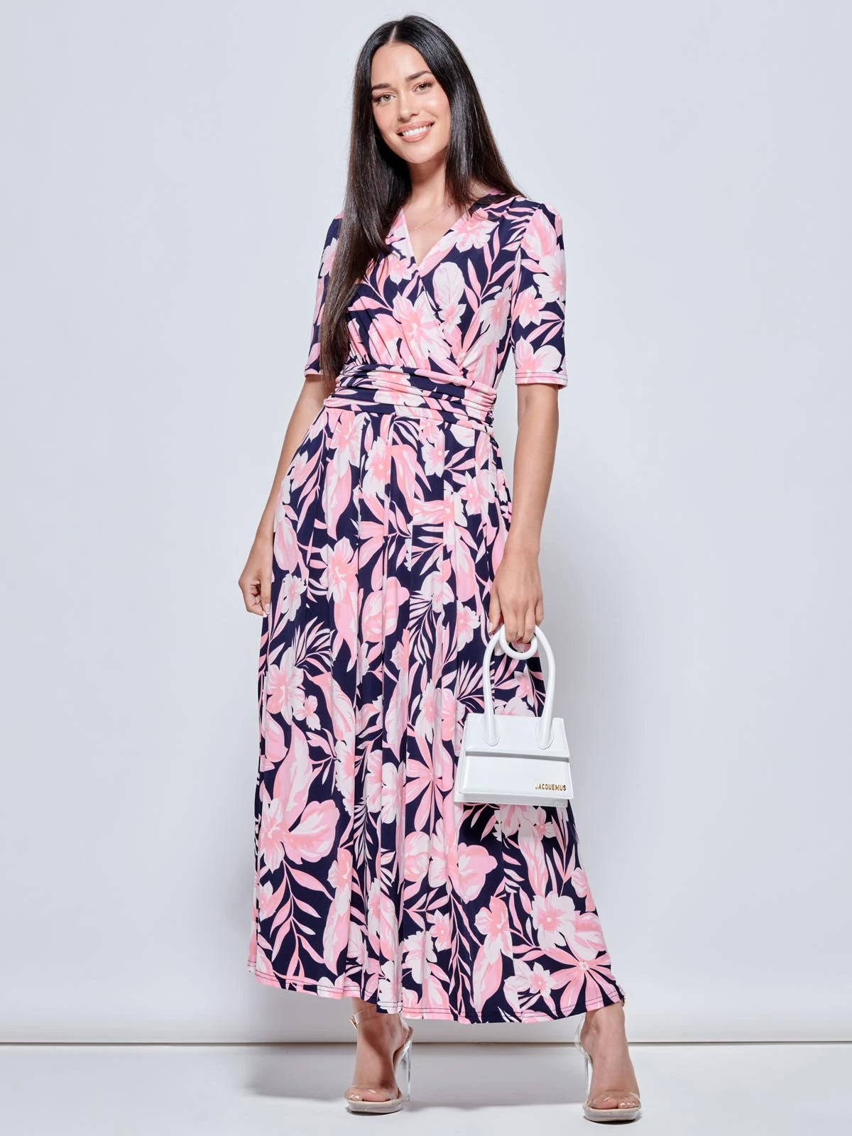 Graceful from top to bottom, the Saniya maxi dress from Jolie Moi is covered in a beautiful daisy floral print. Versatile with its elegant wrap over v-neckline and smart elbow length sleeves, it is completed with functional pockets and a ruched elasticated waistband which draws in your silhouette for a form-flattering fit. The dress is made from our signature non-static and crease proof jersey fabric.