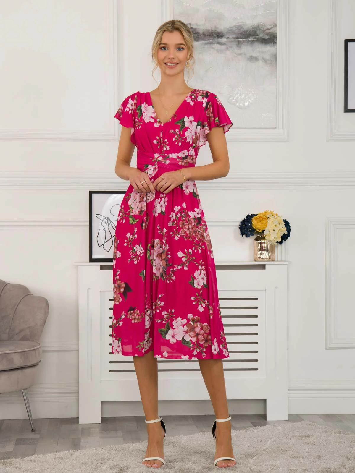 The latest addition to Jolie Moi’s blooming roster is this midi dress in a pretty floral print. Fashioned from a lightweight mesh, the ruched detail around the waist adds a beautiful finishing touch. Flaring out at the hem for added movement, this is a perfect dress for that Summer wedding!