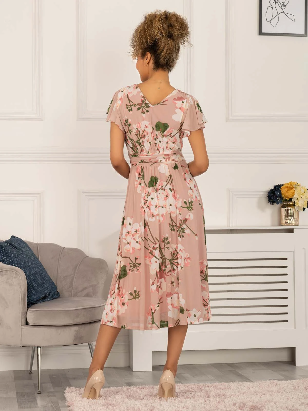 Get this beautiful Jolie Moi dress into your wardrobe this season. Framed with a flattering wrap over v-neckline and flare capped sleeves, it will lend a feminine feel to your wardrobe. Complete with invisible back zip fastening, side pockets, and fully lined for comfort. This piece wears well with your favourite heels and jewellery for all-out glamour.
