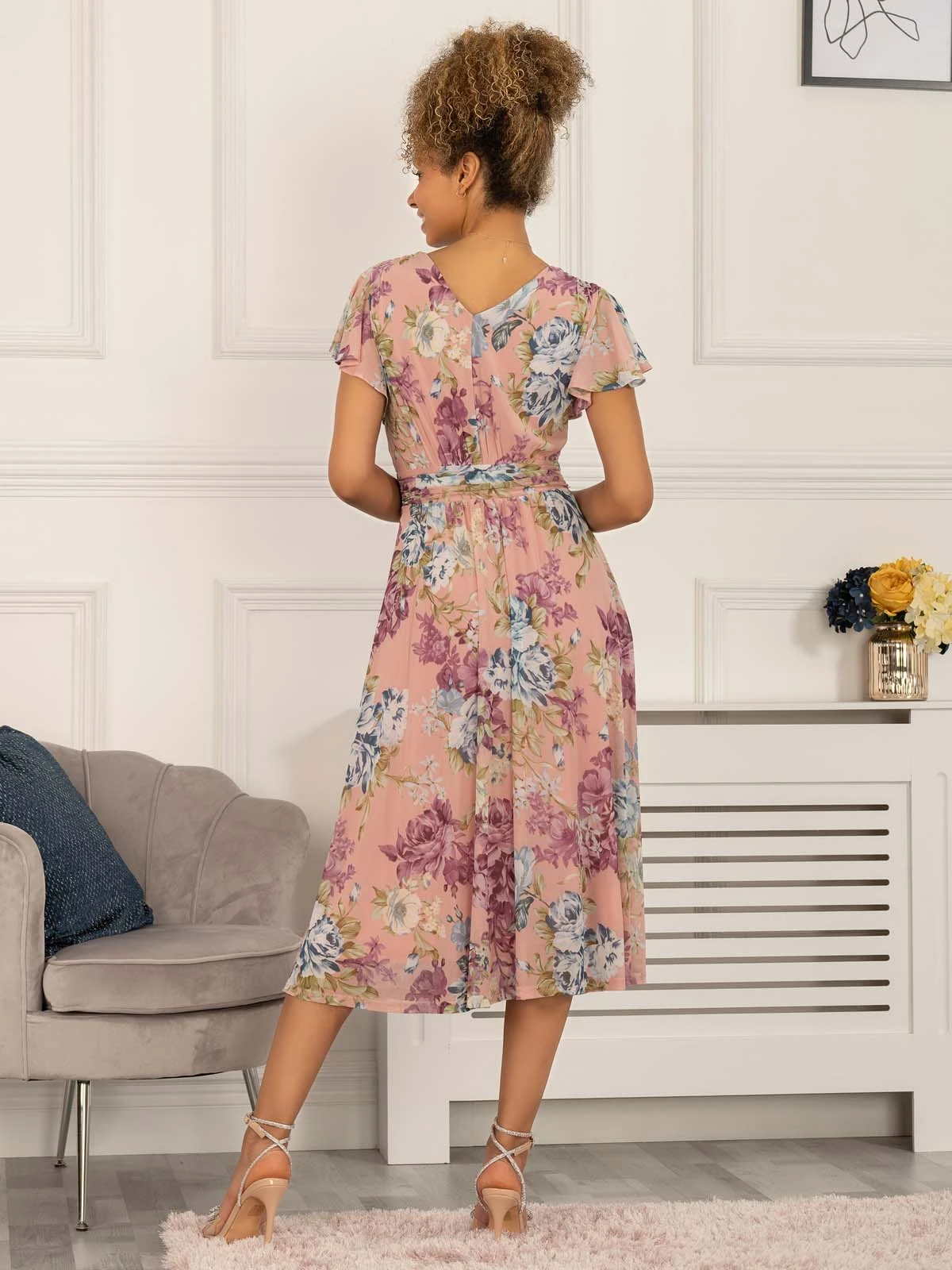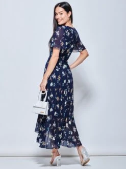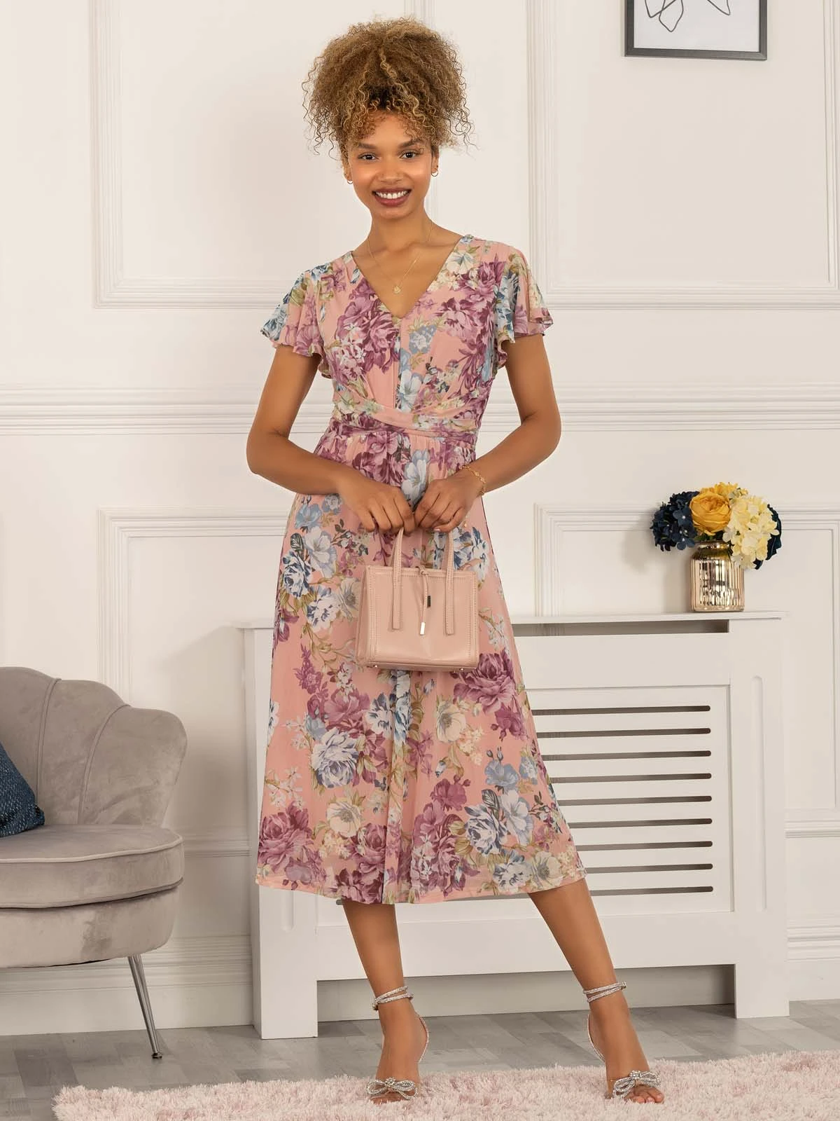 Get this beautiful Jolie Moi dress into your wardrobe this season. Framed with a flattering wrap over v-neckline and flare capped sleeves, it will lend a feminine feel to your wardrobe. Complete with invisible back zip fastening, side pockets, and fully lined for comfort. This piece wears well with your favourite heels and jewellery for all-out glamour.