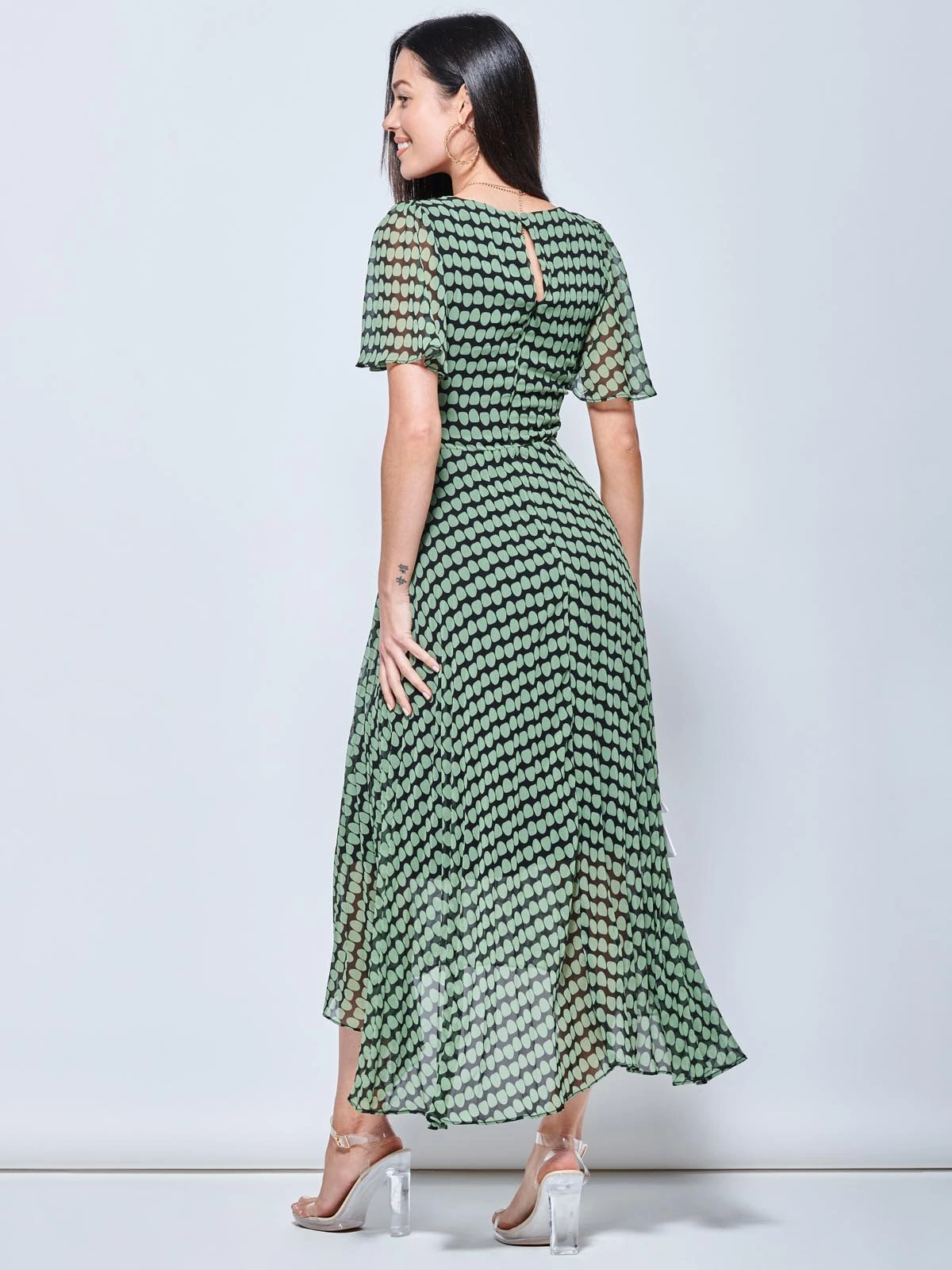 Step into the spot light with this chiffon pleated maxi dress from Jolie Moi. Decorated with a polka dot pattern print. Complimented by a v-neckline, short angel sleeves, and a high-low hemline for added flare. Throw on a pair of strappy heels for an instant ready look.